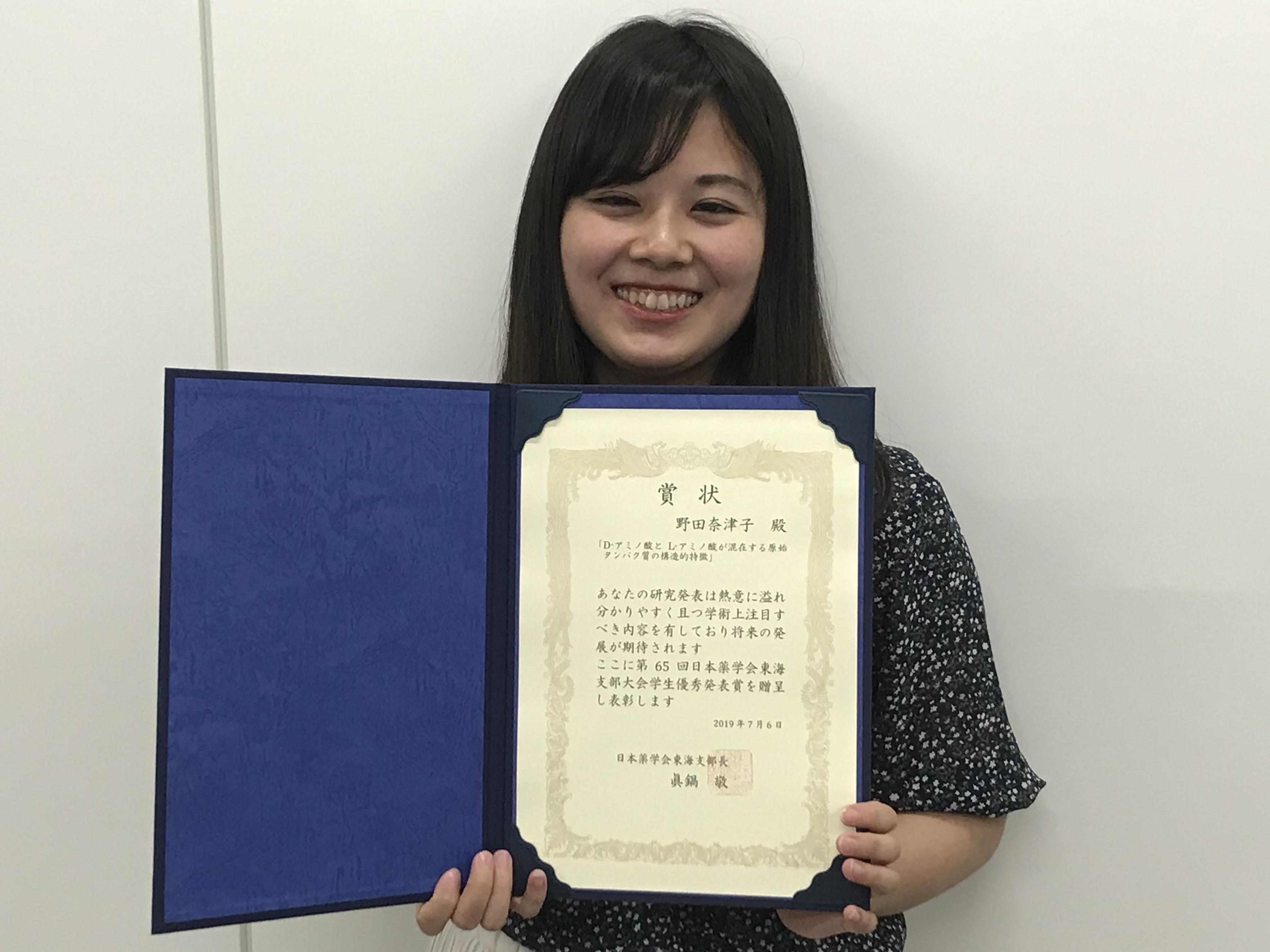 トップページ/受賞 薬学部の野田さんが日本薬学会東海支部大会で学生優秀発表賞