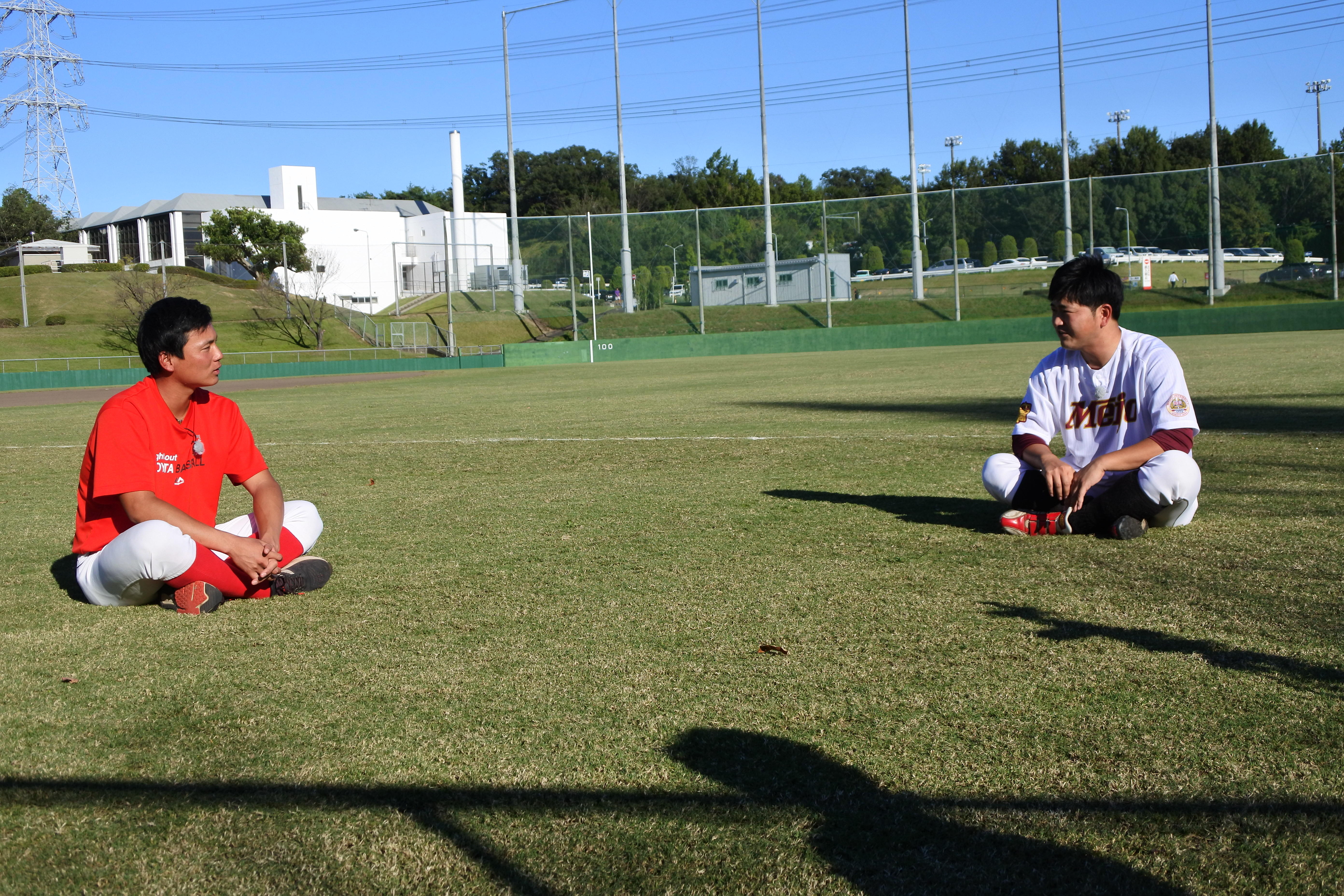 硬式野球場外野の芝生の上で行われた対談で、栗林投手は「大学時代に壮馬さんに会ってプロを意識した」と話し、山内コーチは「成長した姿を見ることができてうれしい」と喜んでいました。