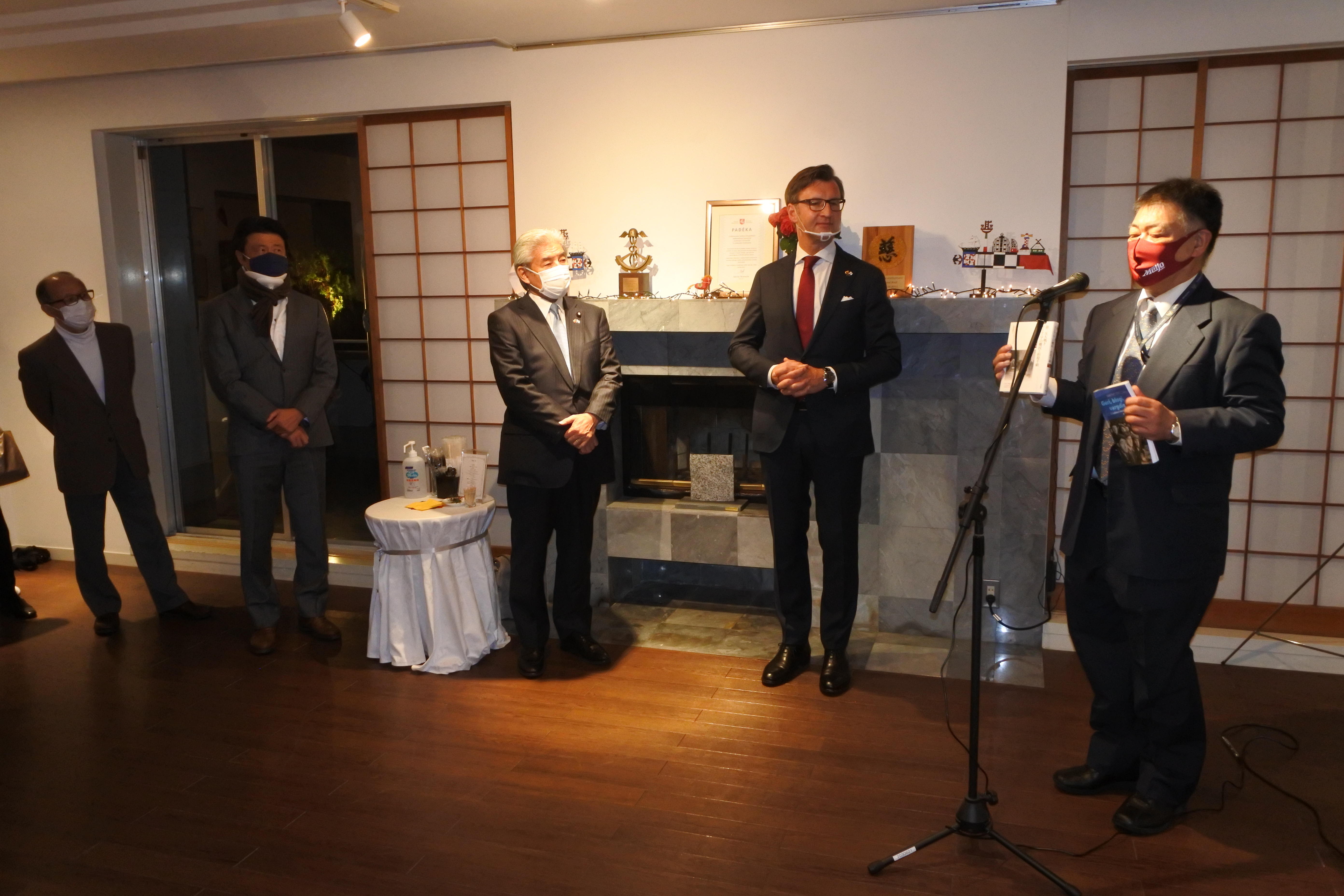 パーティーでは、冒頭、ゲディミナス・バルブオリス大使が「杉原は日本社会が誇れる偉人である」などとあいさつ。日本・リトアニア友好議員連盟会長の中曽根弘文参院議員が祝辞を述べました。