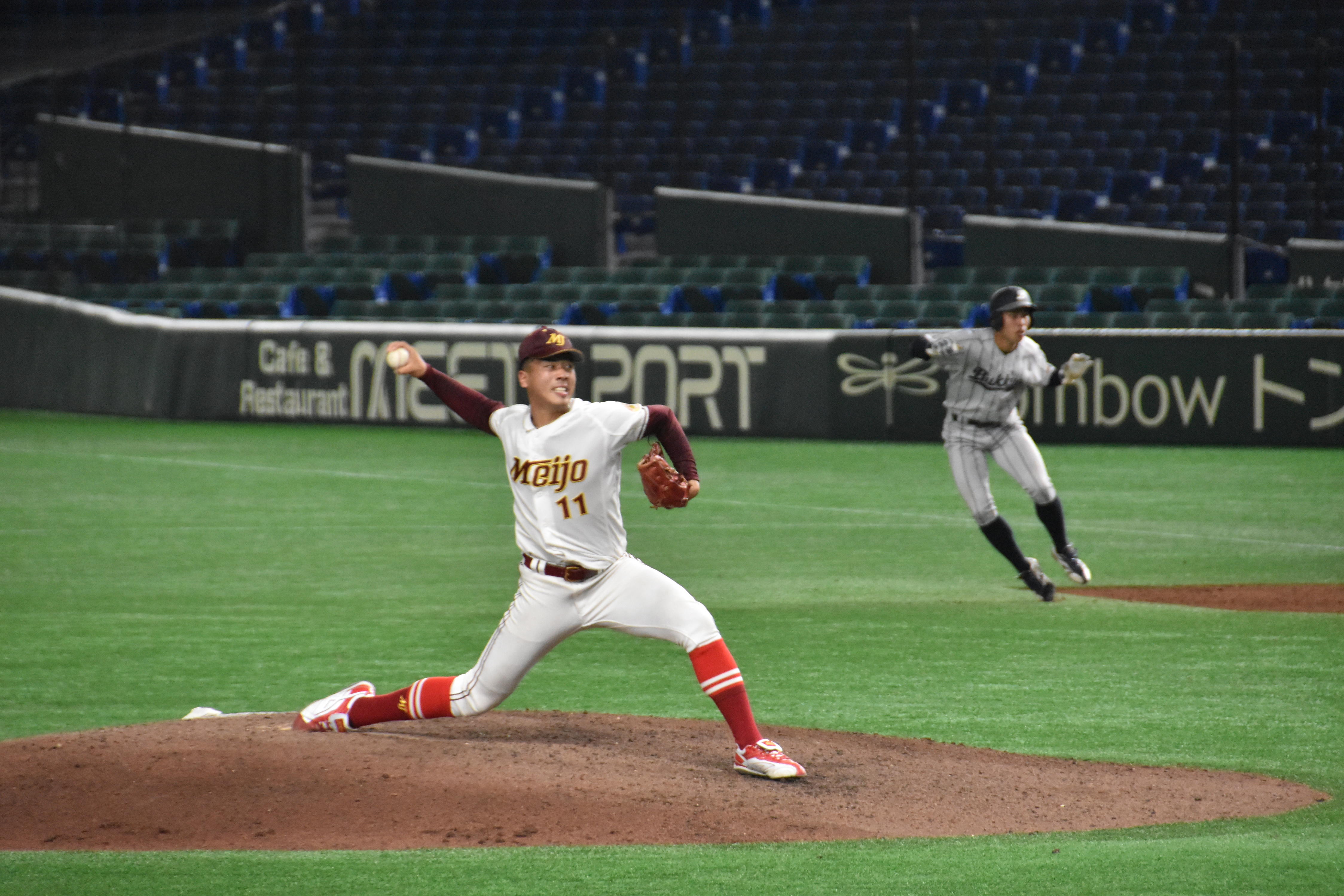 2回戦で中継ぎとして好投した眞田拓投手(人間学部3年)=東京ドームで