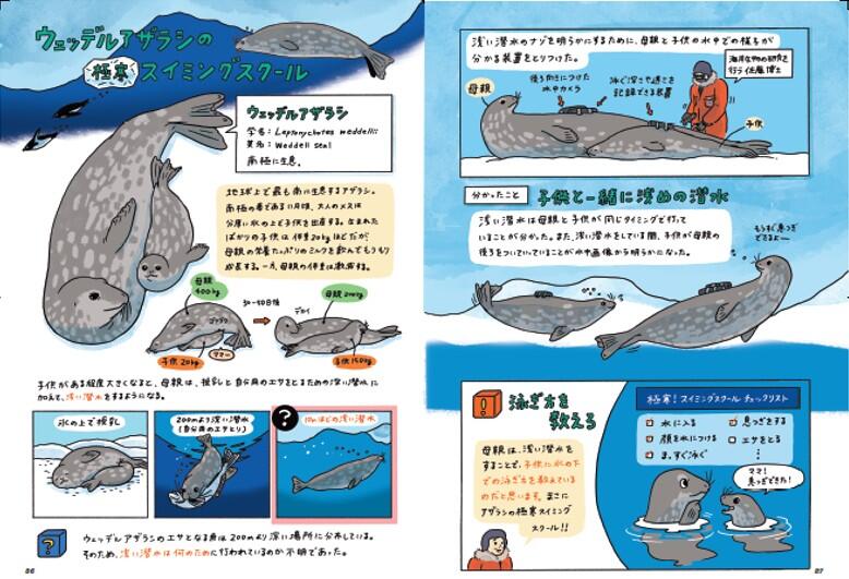 例えば、集団で狩りをするライオンは「それぞれ決まった役割はあるのか?」と疑問を持った研究者が5年間にわたって観察して分析した結果、ラグビーのように得意のポジションに分かれて特定の陣形をとっていたことが分かったことや、アザラシが浅い潜水をするのは「子どもアザラシに泳ぎ方を教えているから」と結論が導かれ、「まさにアザラシの極寒スイミング」とユーモラスに紹介しています。