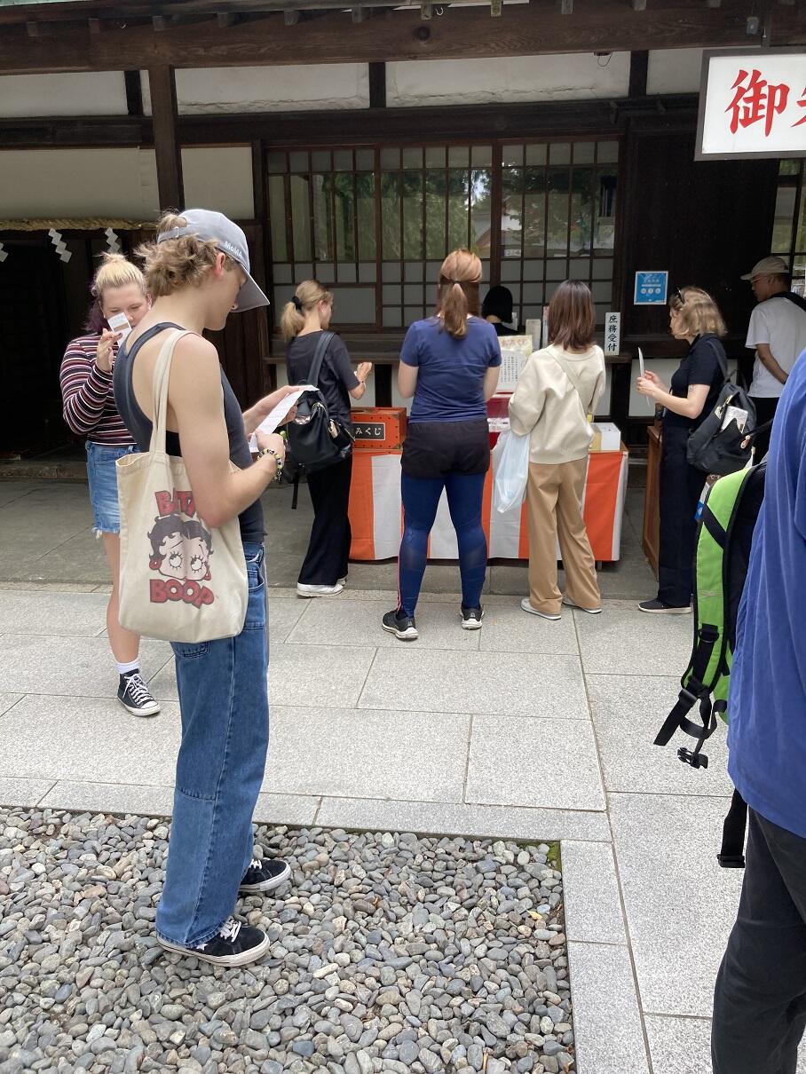 富士本宮浅間大社の見学後におみくじや記念品などを買い求める参加者