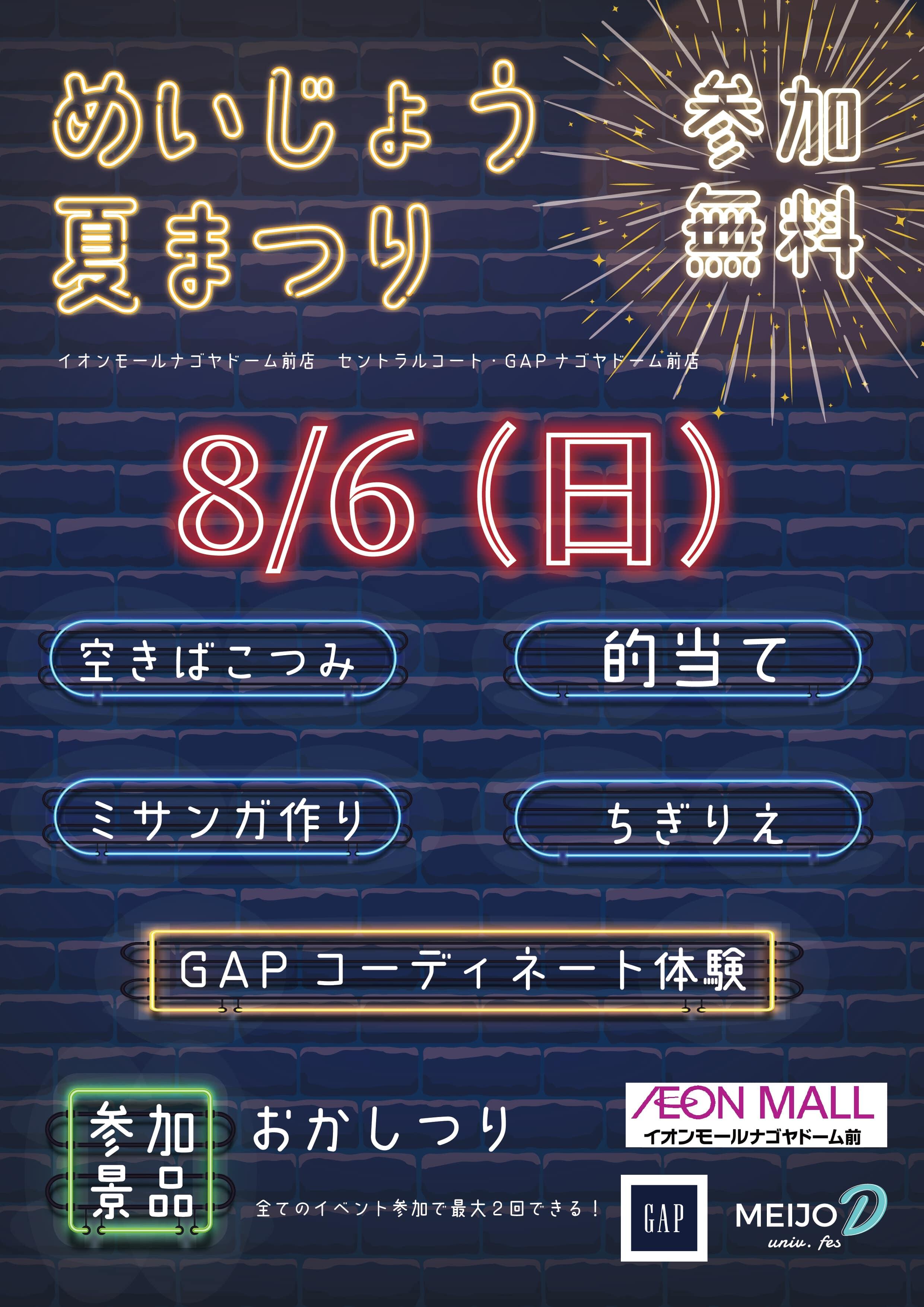 今回は以下記載のとおり『夏まつり』と題し、縁日企画やGAP/GAP kidsイオンモールナゴヤドーム前店とのコラボレーション企画を実施します。皆様のご参加をお待ちしています。
