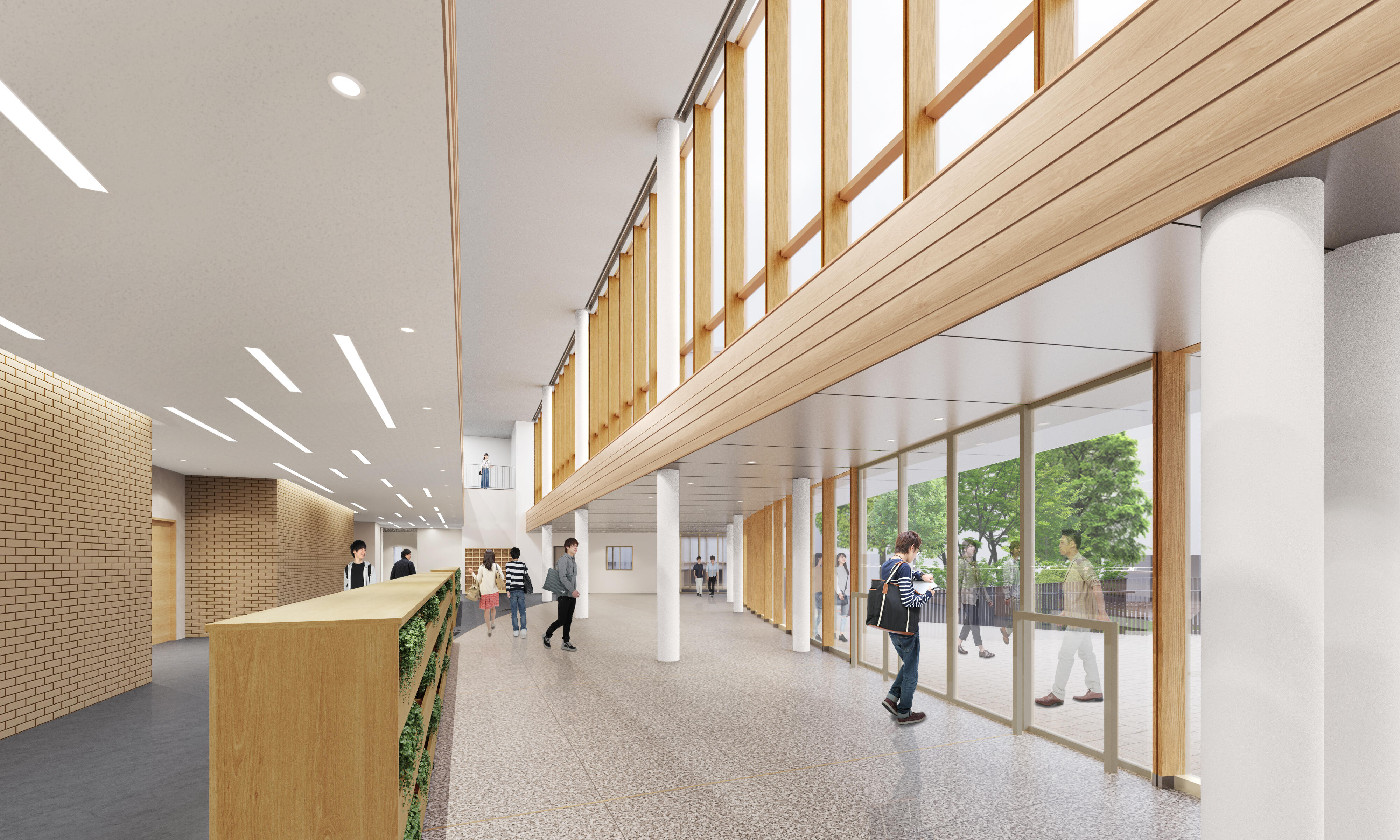 記念アリーナはRC造+S・W造の地下1階・地上3階建てで、延べ床面積は1万3927㎡です。バスケットコート4面分のメインアリーナに加え、サブアリーナ、柔剣道場、トレーニング室などからなり、体育の授業やクラブ・サークル活動で使用するほか、入学式や卒業式などの式典や大型イベントも実施します。隣接して建設するRC造地上5階建て延べ床面積3959㎡のクラブハウス棟とともに学生の新たな活動拠点となります。