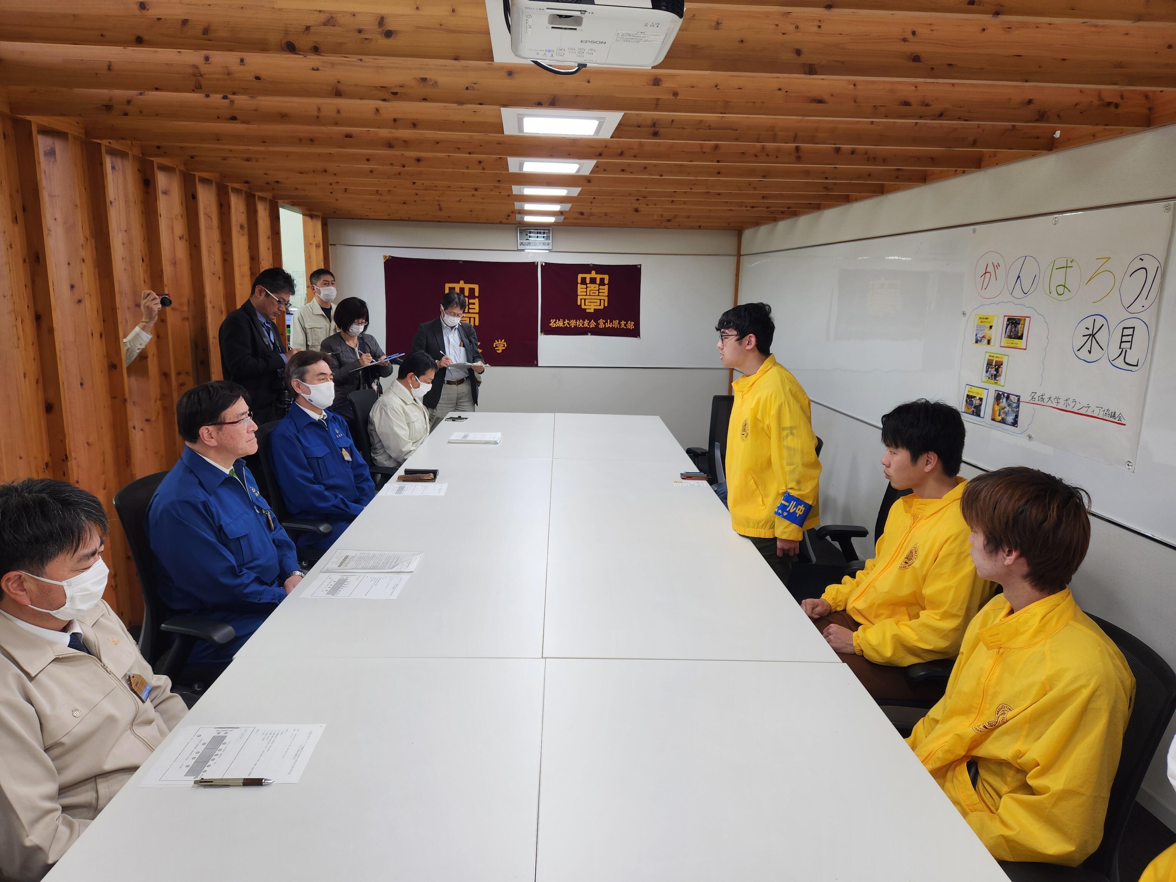 高島会長らは災害ボランティアとして復旧活動を手伝うため、14日に天白キャンパスを出発して午後に氷見市入りし、市役所で林市長に寄付金の目録を手渡しました。高島会長は「元日の地震で心が痛み、みんなで1月5日から募金活動を始めました。少しでも早く震災前の生活が取り戻せるようにできる範囲で精いっぱい頑張りたい」と災害ボランティアとしての活動に意欲を示しました。