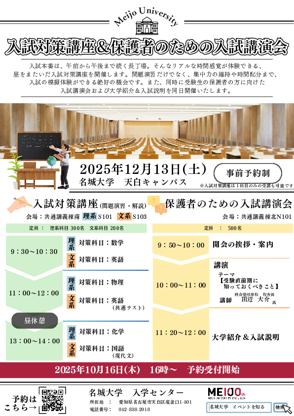 12月13日(土)に天白キャンパスにて予備校講師による入試対策講座と受験を控える保護者様向けに「受験直前期に知っておくべきこと」をテーマに講演会を開催いたします。