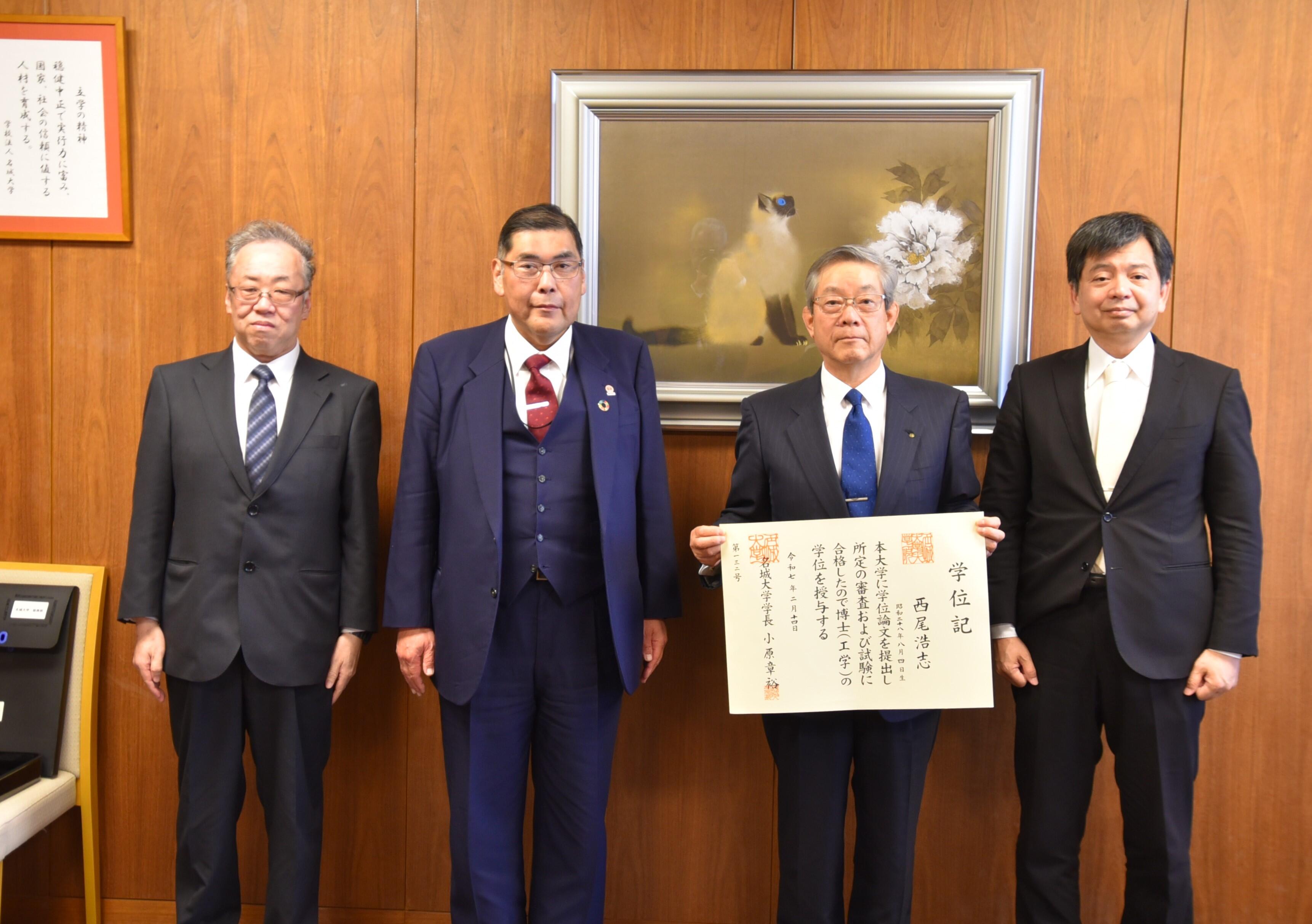 授与式には児玉哲司・理工学研究科長と論文主査の石川教授も同席し、学位記を受け取った西尾さんは「論文作成は5月から始め、短い時間でしたが集中して取り組むことができ、楽しかったです。石川先生のご指導のおかげです」と振り返りました。そして「もともと生涯現役が初心で、会社の業務を退いた後は業界や学会の方々の相談に乗ることができるような窓口を作りたい」と意欲を見せていました。