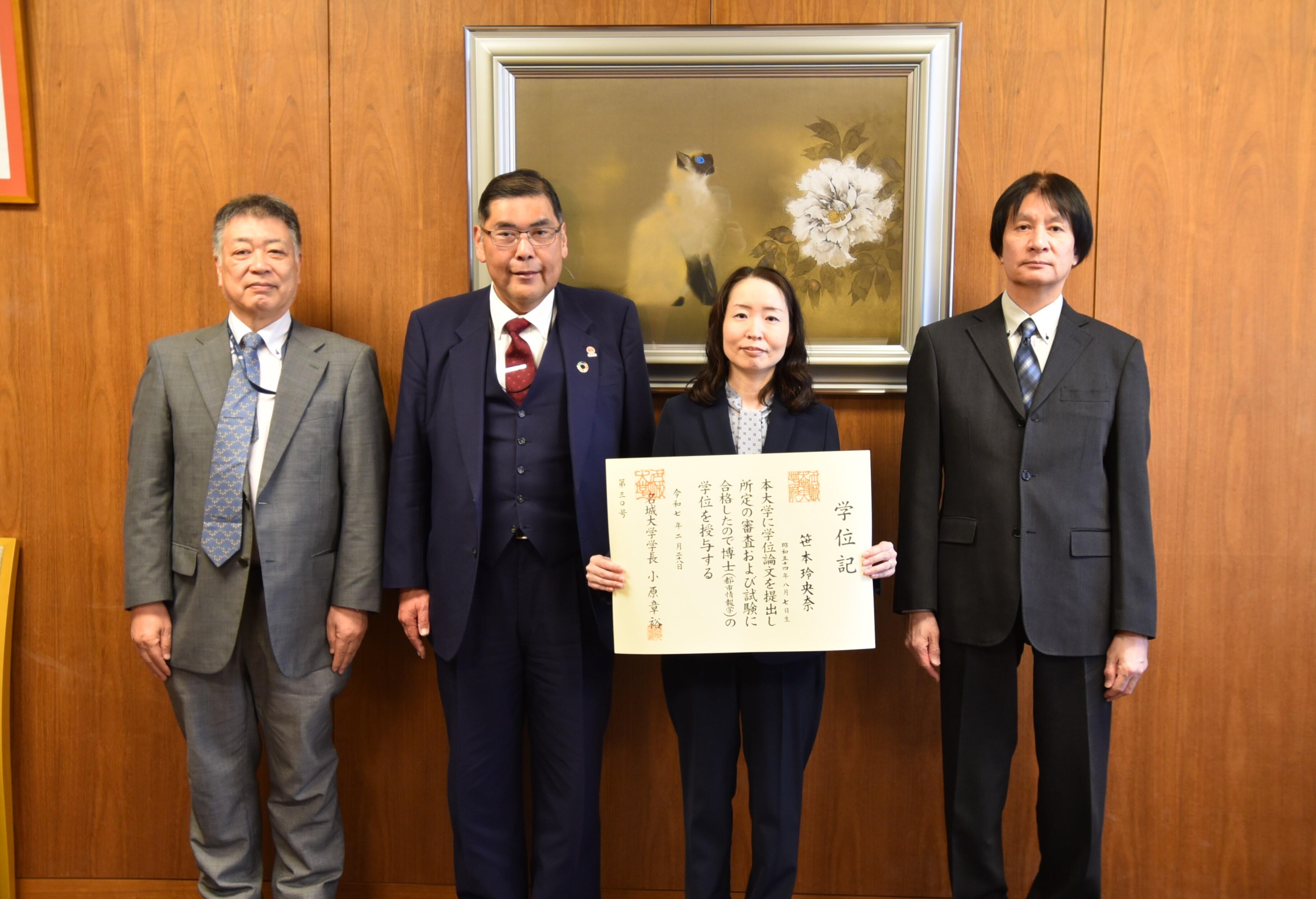 授与式には亀井栄治・都市情報学研究科長と稲葉教授(論文主査)が同席。小原学長から論文作成で苦労した点を聞かれた笹本さんは「私の専門は国文学ですが、歴史学や音楽など専門外のいろいろなジャンルに接する研究になり、勉強になりましたし、楽しかったです」。500ページにも及ぶ今回の論文をもとに本を出版する予定で「一般の方にも分かりやすくまとめ、年内に出版したい」と話していました。