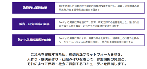 同大が主導する「大学DXアライアンス」は、DXによる先導的な業務改革を戦略的に実行し、ニューノーマル時代に相応しい教育・研究環境を実現し、魅力ある職場環境を創るべく、地域・組織の枠を超えた連携を通じてさまざまな取り組みを行っています。本学も4月25日に参画し、事例や業務DXのスキル・ノウハウを活用させていただくとともに、大学DXアライアンスに参画している機関と情報共有をとおして、本学の抱える課題を解決していきます。