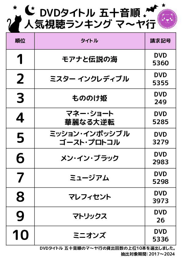 今年度は、メディア室の約4000本のDVDより「DVDタイトル五十音順、アルファベット順人気視聴ランキング」として、DVDタイトルの行ごとの貸出回数の上位それぞれ10本を発表しています。