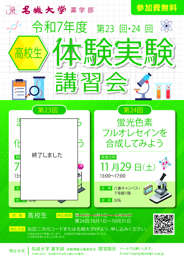 トップページ/ニュース 名城大学薬学部で令和7年度高校生体験実験講習会開催!11月開催の参加申込受付中!