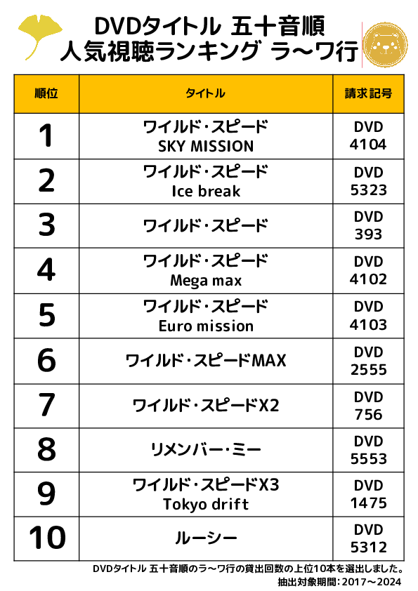 今年度は、メディア室の約4000本のDVDより「DVDタイトル五十音順、アルファベット順人気視聴ランキング」として、DVDタイトルの行ごとの貸出回数の上位それぞれ10本を発表しています。11月は、ラ~ワ行です。