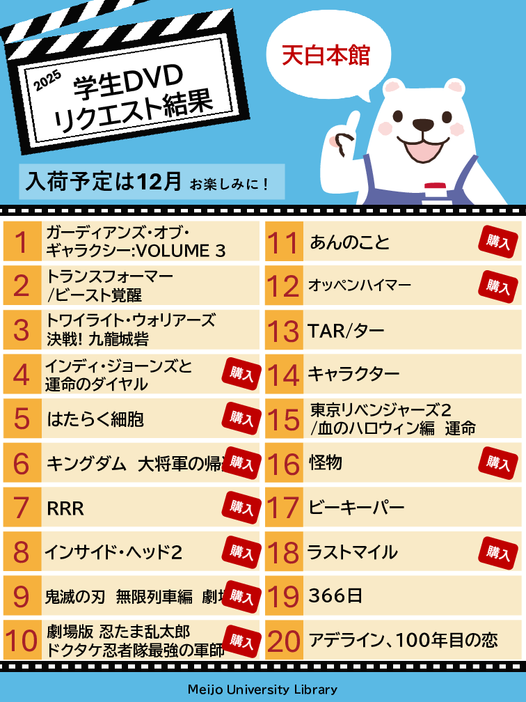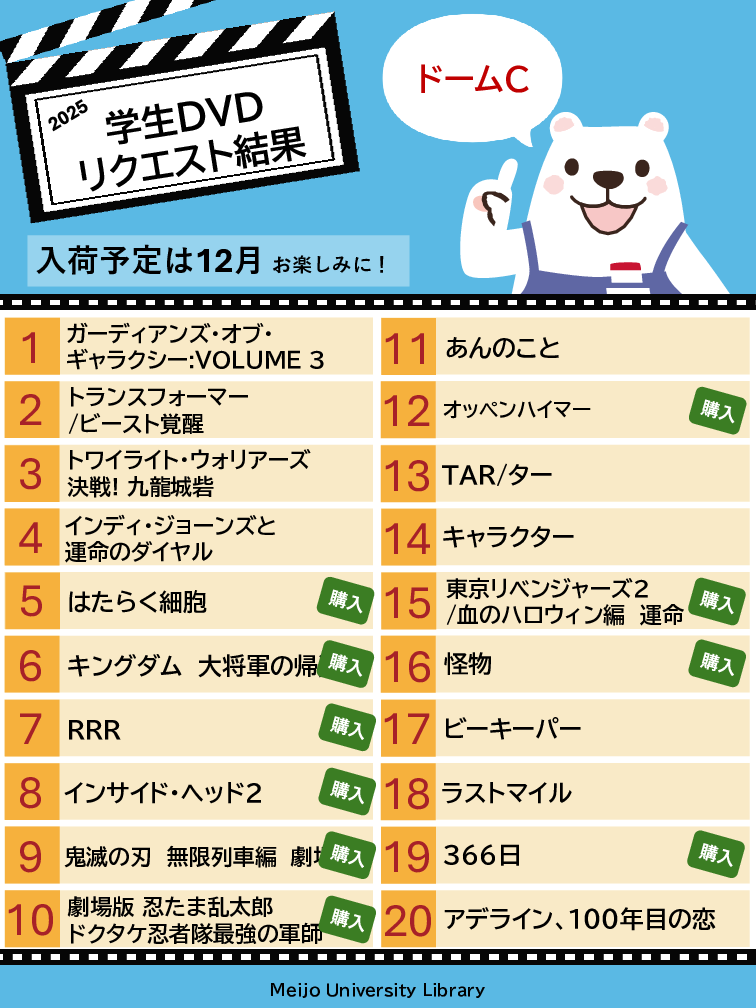 10月におこなったDVDリクエスト投票による購入作品が決定しました。多数のご参加ありがとうございました。Googleフォームとシール投票の2つの方法でおこない、結果は添付ポスターの通りとなりました。本館は10位が同数だったため、11本購入します。