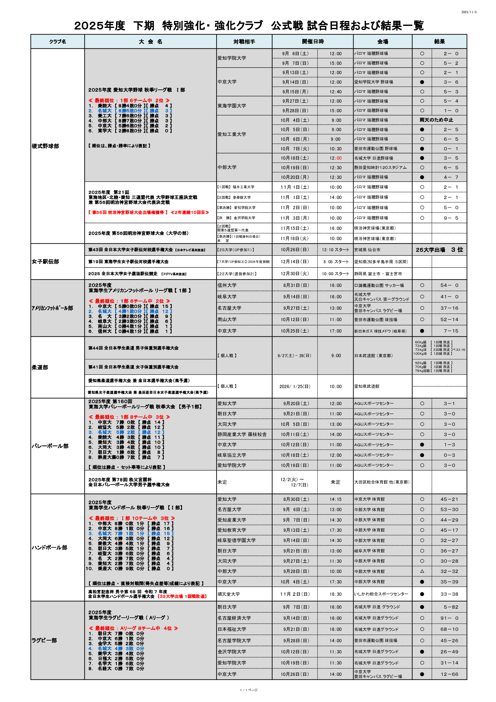 特別・強化クラブの11月1日~11月3日の試合結果です。