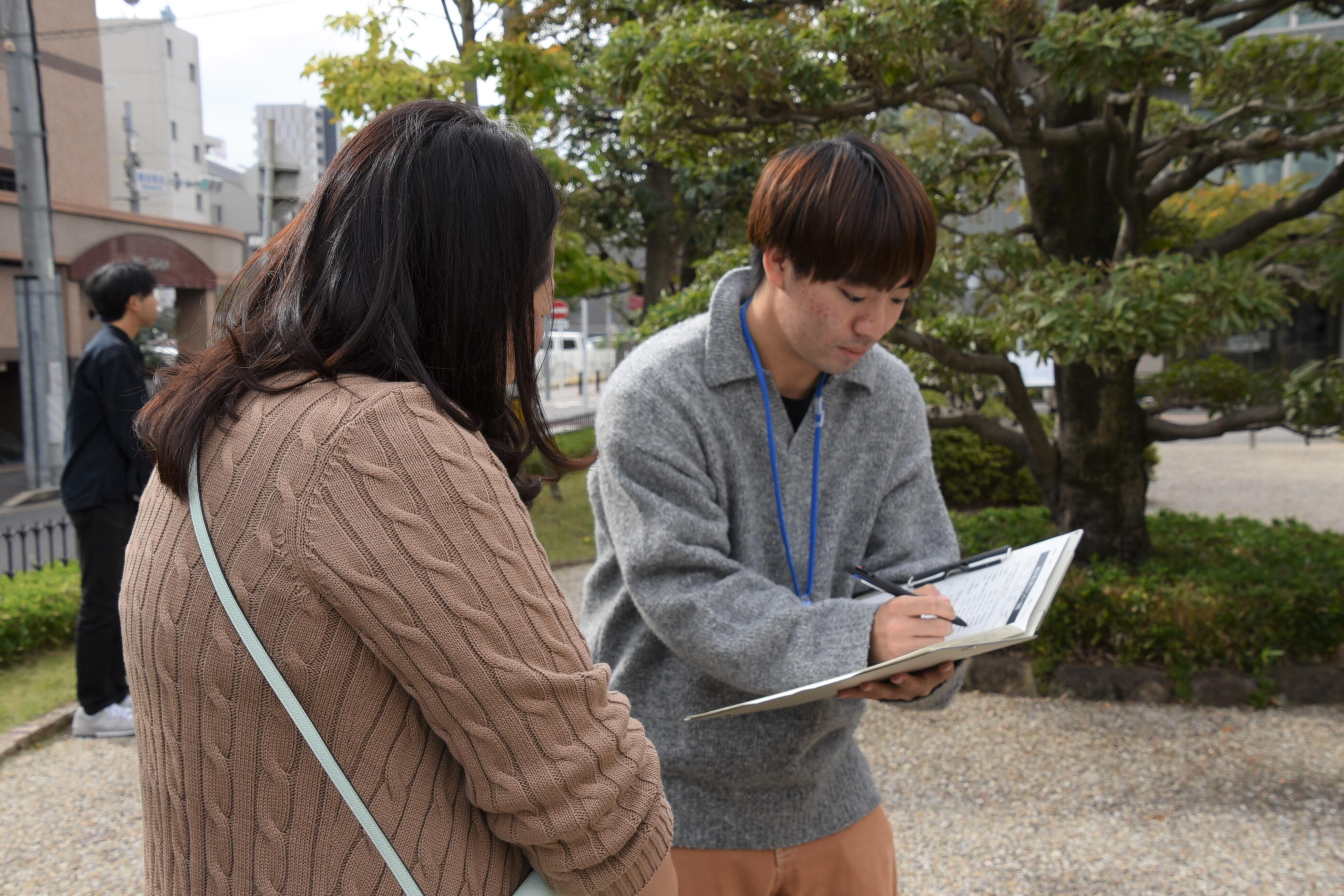 各施設で学生たちは、アンケート項目を記した用紙を手に来場者に声を掛けて協力を依頼し、一問ずつ丁寧に尋ねて質問。インバウンドの姿が目立った名古屋城では、外国人観光客の意見も取り入れようと調査する姿も見られました。