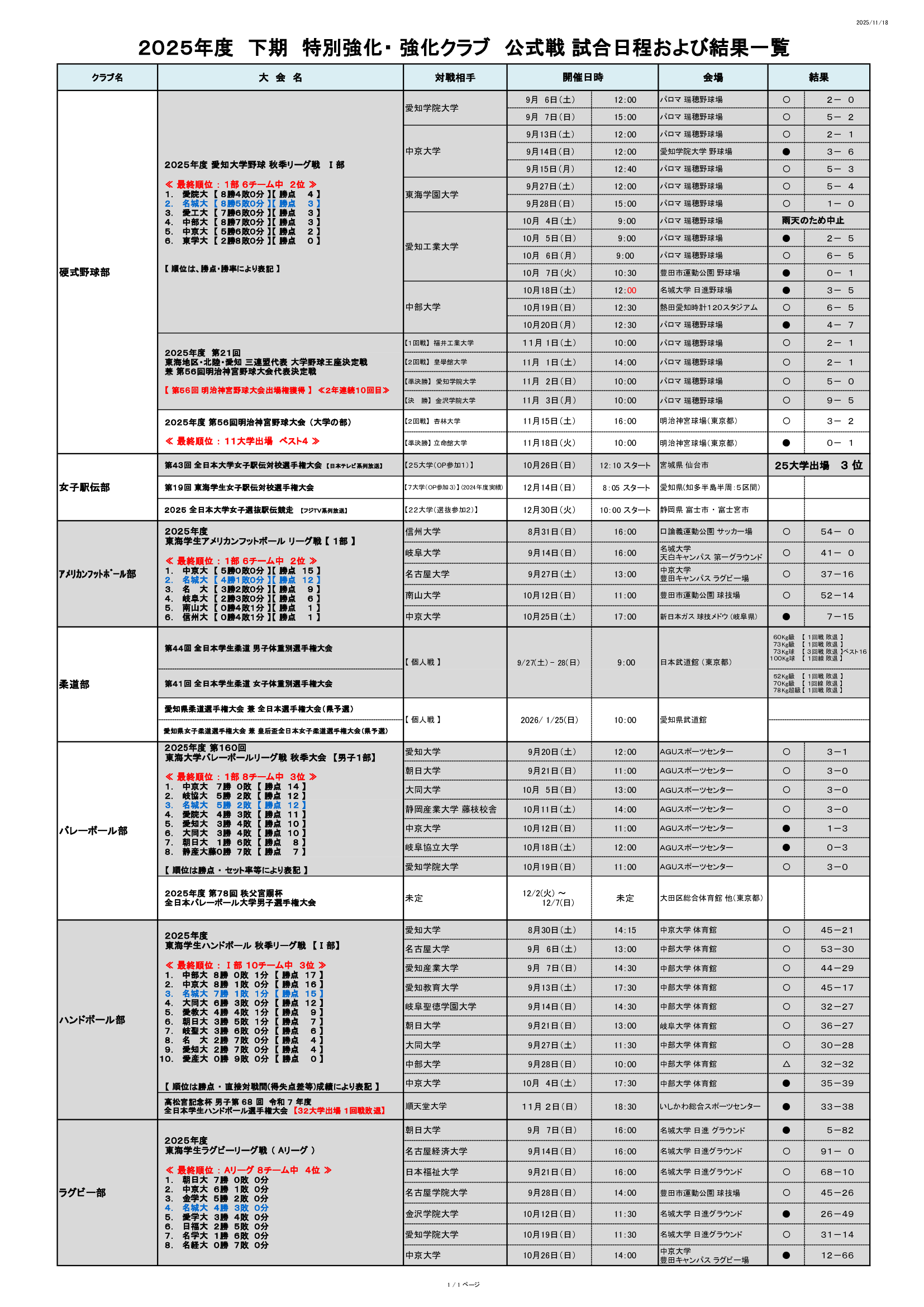 2025年度 下期 特別強化・ 強化クラブ 公式戦 試合日程および結果一覧