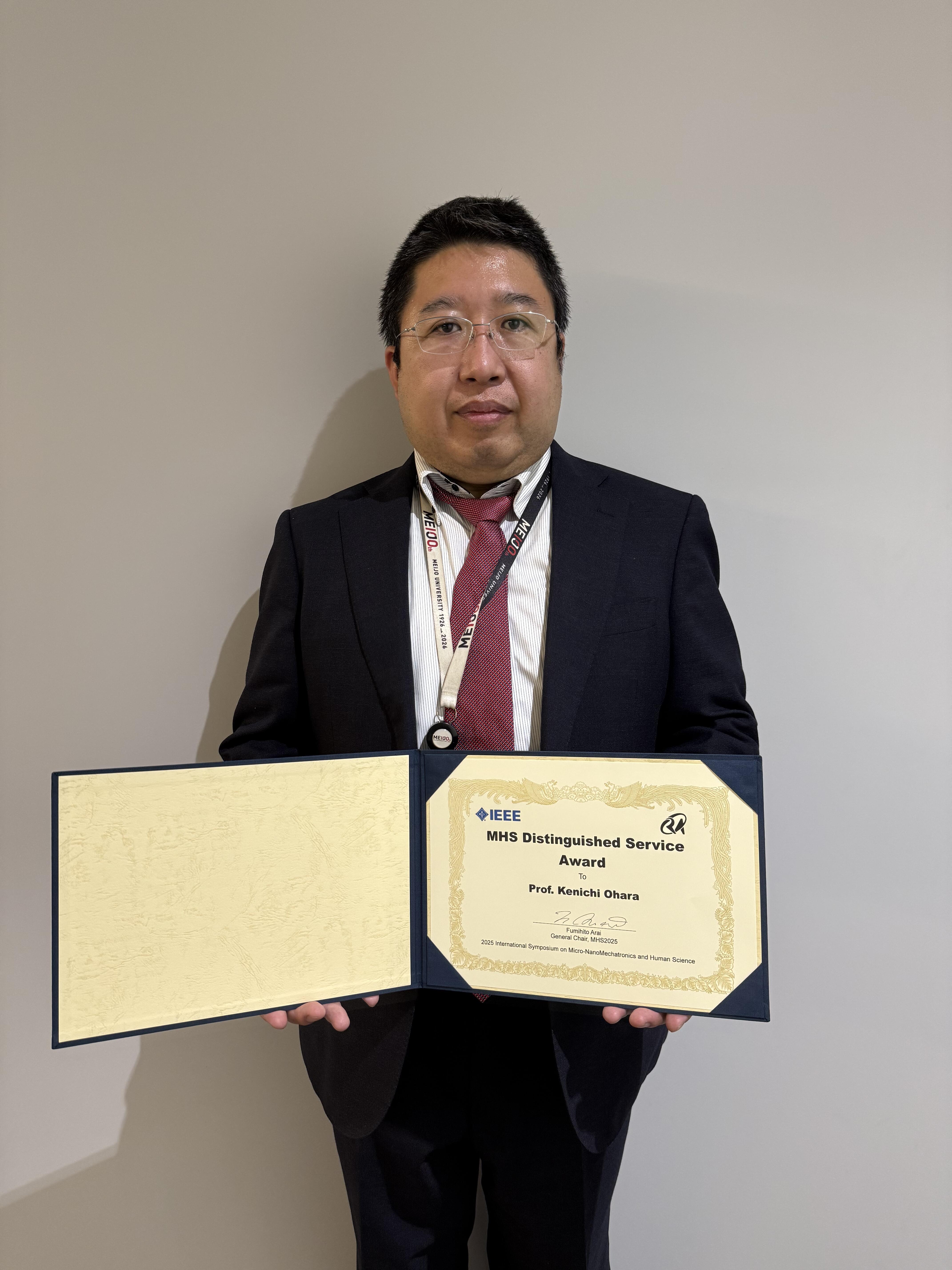 理工学部メカトロニクス工学科の大原賢一教授は、2025年11月23日から25日に名古屋大学で行われた36th 2025 International Symposium on Micro-NanoMechatronics and Human Science (From Micro & Nano Scale Systems to Robotics & Mechatronics Systems) (MHS2025)において、これまでのMHSの開催における貢献として、「MHS Distinguished Service Award」を受賞しました。 大原賢一教授は「名古屋で毎年行われるこの会議を通じて、この地域を始め日本、世界の学術研究に貢献できるようがんばっていきたい」と今後の意欲を述べています。 |