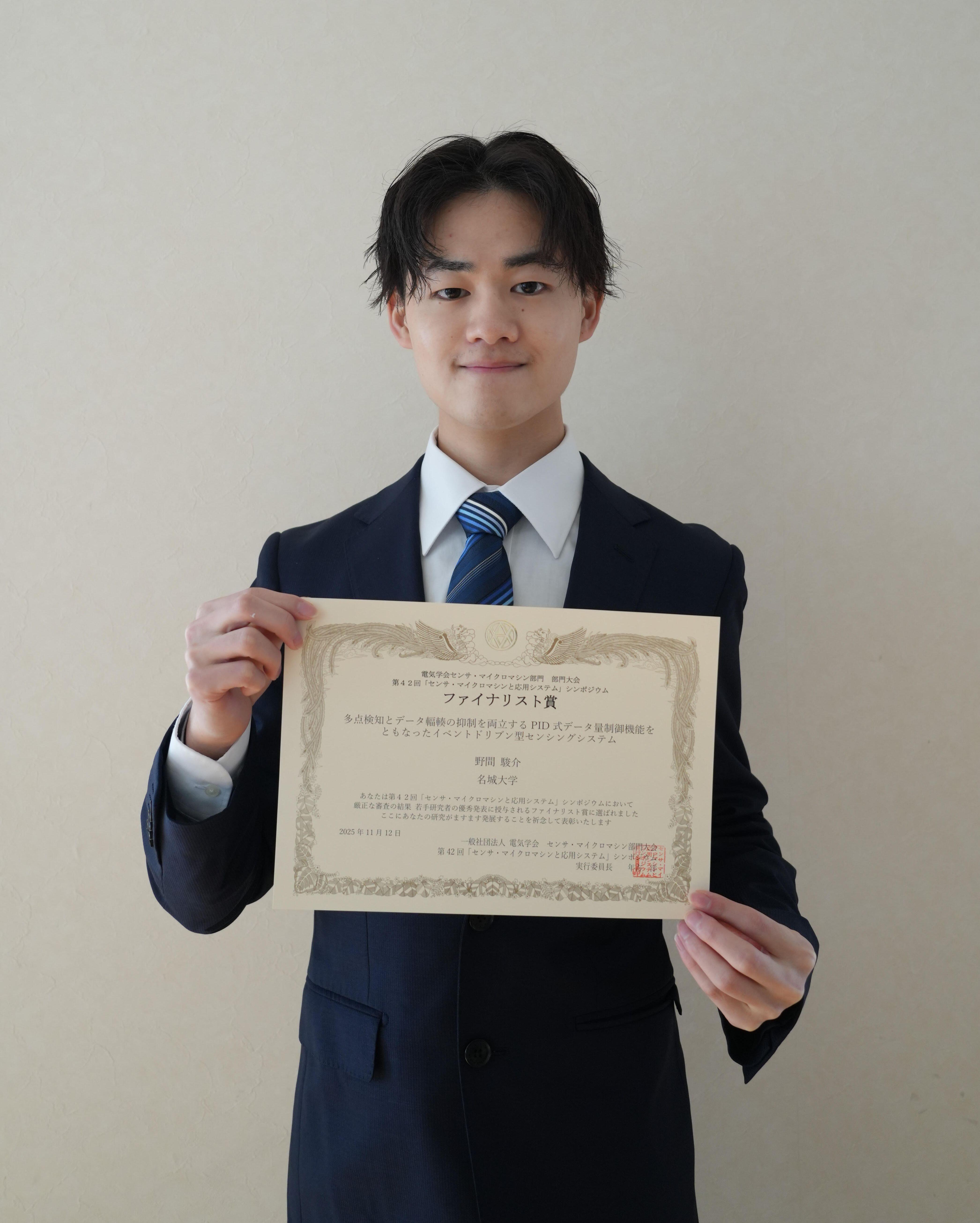 2025年11月10日~13日に、宇都宮にて開催された第42回「センサ・マイクロマシンと応用システム」シンポジウムにおいて、メカトロニクス工学専攻修士課程2年の野間駿介さんがファイナリスト賞を受賞しました。本シンポジウムは電気学会E部門が主催するセンサ及びマイクロマシンと、その応用システムに関する国内主要学会です。本表彰は35歳以下の若手研究者の優秀発表に対して授与されます。野間さんは、多数のセンサからなるイベントドリブン型センサネットワークにおいて、ネットワークの高時間分解能センシングとデータ輻輳の抑制を両立するPID式データ量制御機能を提案し、その効果を示したことが高く評価されました。 |