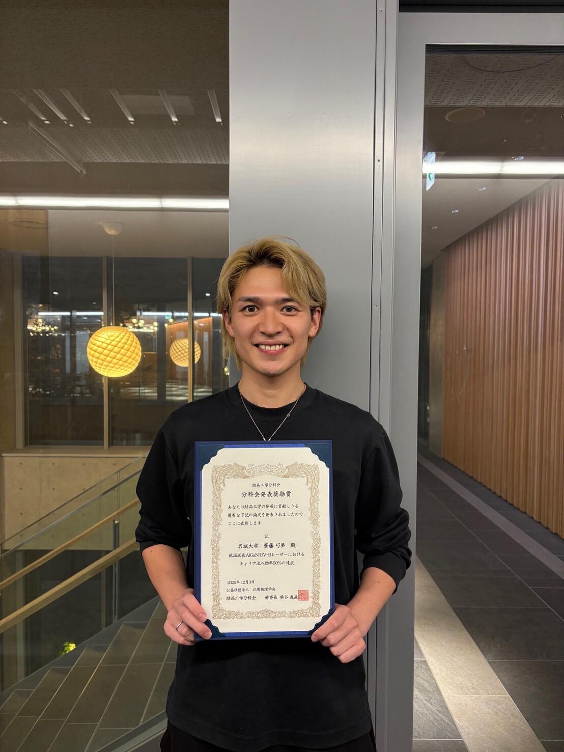 「結晶工学分科会 分科会発表奨励賞」は、第4回結晶工学講演会 (2025) において優れた研究発表を行った者に授与される賞です。本研究では、殺菌や医療、環境モニタリングなど幅広い応用が期待される深紫外レーザーダイオード(UV-B LD)の高効率化に取り組みました。シミュレーションによる構造設計と実験を組み合わせ、材料界面の急峻性がキャリア輸送とデバイス性能に与える影響を体系的に解明しました。従来、高品質AlGaN成長には1000~1300℃が用いられてきましたが、775℃という低温成長を適用することで、注入効率を従来の15%から50%へ向上させました。さらに、サファイア基板上のUV-B領域(約318 nm)で世界初となるCW発振を実現し、深紫外光源の実用化に向けた重要な成果として高く評価され、今回の受賞に至りました。 |