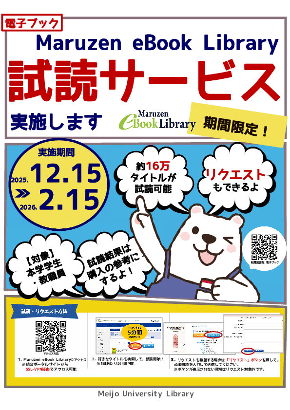 電子ブック『Maruzen eBook Library』の試読サービスを実施します。気に入ったタイトルはリクエストも可能ですので、この機会にぜひご活用ください。