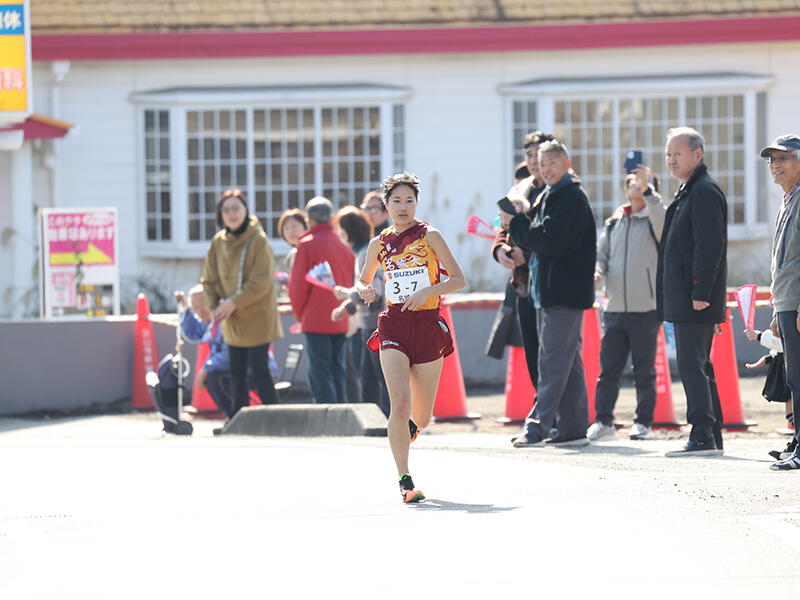 最長10.5kmの5区は、1年生の細見芽生選手(人間学部1年)が出走しました。前方では大東文化大学のケニア人留学生が先頭を奪い、東北福祉大学、城西大学がそれを追走。本学は首位から1分39秒差の4位で中継し、細見選手は各チームのエースに対峙して区間3位(34分53秒)と健闘しました。
