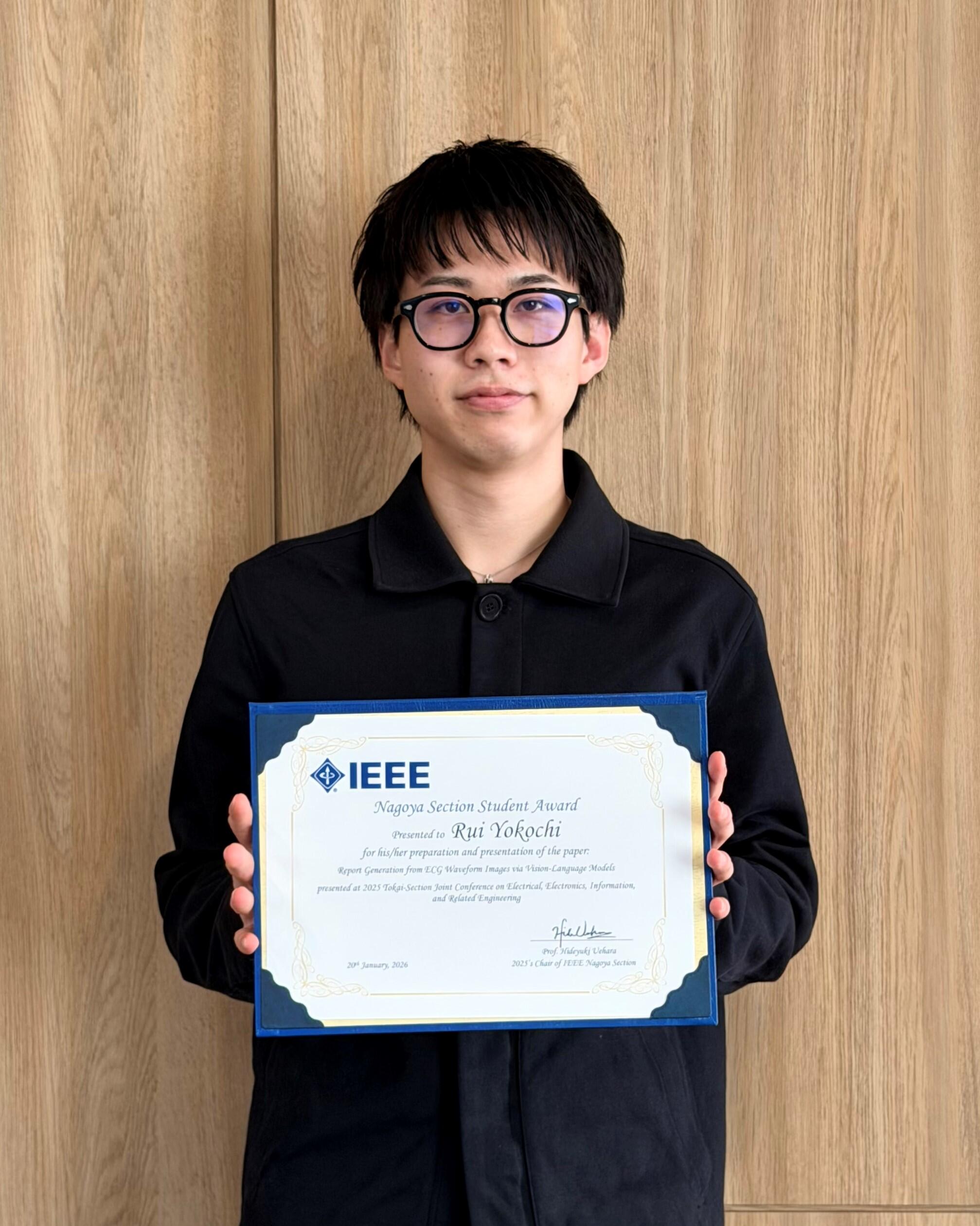トップページ/受賞 理工学研究科の横地累さんが電気・電子・情報関係学会東海支部連合大会でIEEE名古屋支部学生奨励賞を受賞
