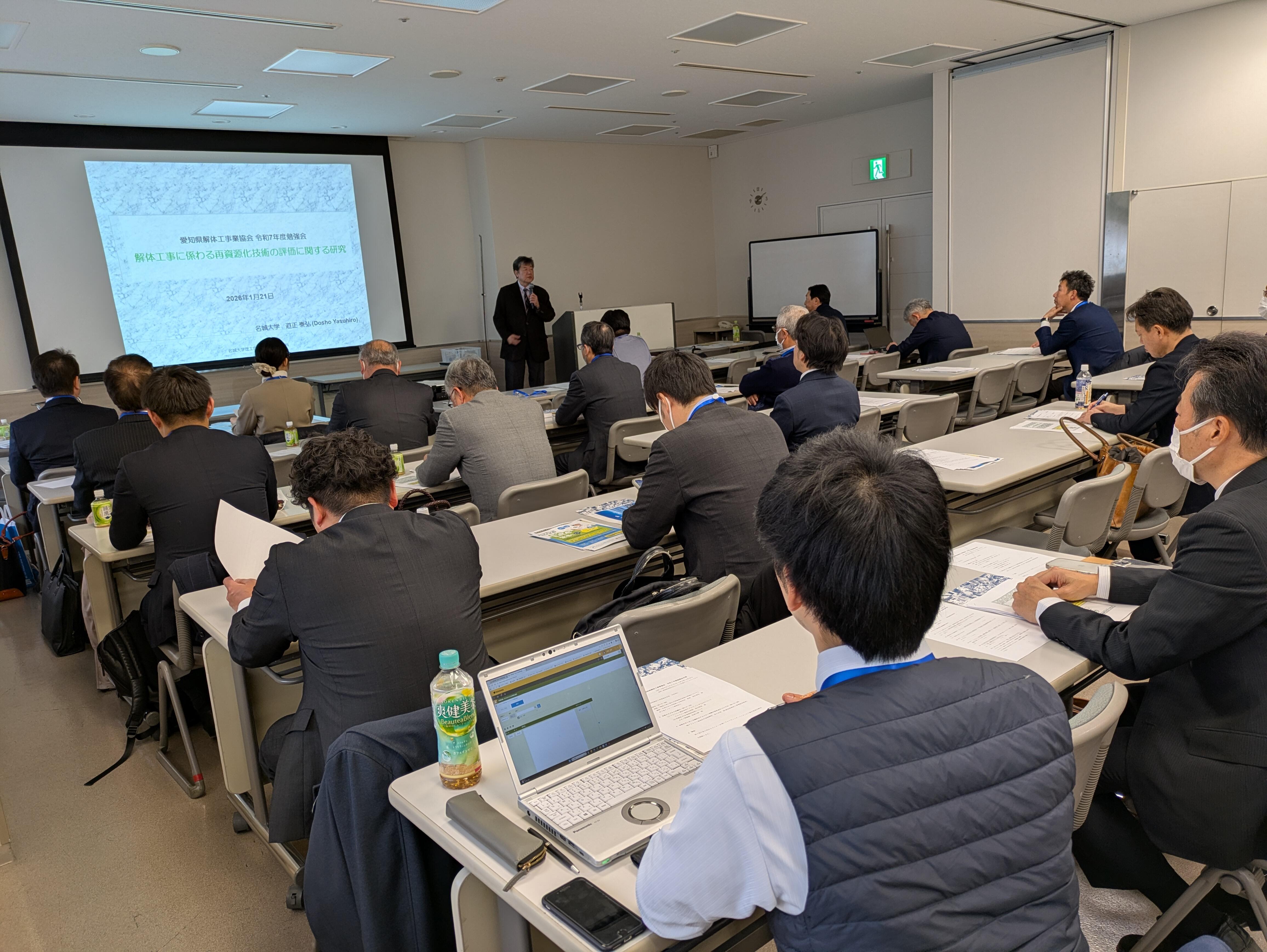 この度,(一社)愛知県解体工事業協会からのご依頼により,令和7年度勉強会※1において「解体工事に係わる再資源化技術の評価に関する研究」といったテーマで講演を実施しました。なお,講演資料※2は下記に公開していますので参照して下さい。 内容は,解体工事に要求される経済性,安全性,環境性の三つの側面から,関連法令や再生骨材,アスベスト対策など幅広いテーマを対象としました。なお,終了後は研究の一環として,資源循環やアスベスト対策をテーマとしたアンケート調査を行いました。 参加者は, 26名でした。具体的には,愛知県解体工事協会の会員等である解体工事会社,産業廃棄物処理会社,アスベスト調査会社等から参加されていました。 |