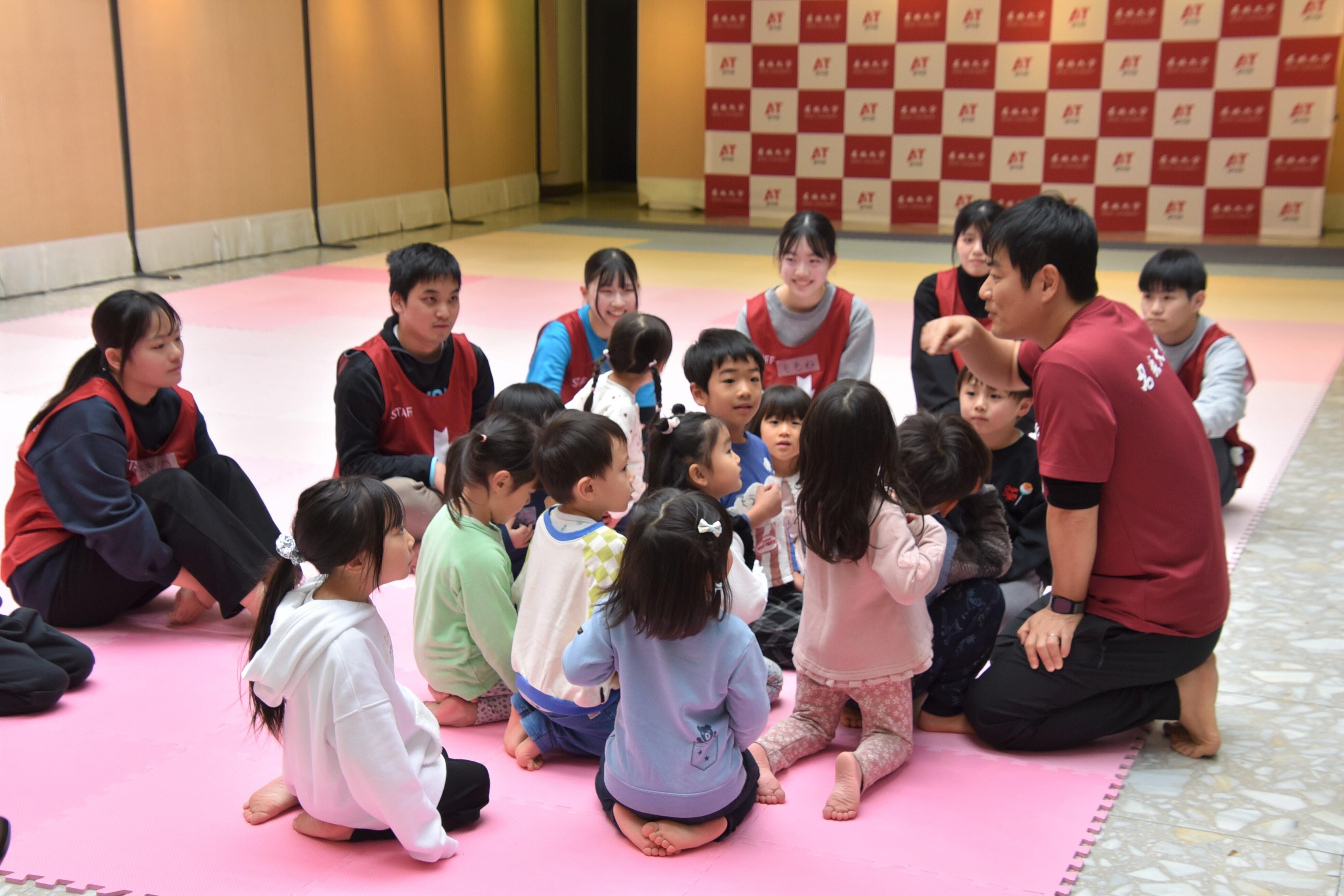 このイベントは2025年2月に続いて2回目の開催で、ATグループが「健康をテーマにした地域貢献活動を名城大学と一緒に実施したい」と本学に提案があり、同社と香村准教授が内容を検討し、包括協定に基づく連携事業の一環として企画されました。「Meijoプレイリーダーズ」は香村准教授の指導のもと、幼少期の子どもたちを対象に運動あそびプログラムを企画・実施している学生団体で、この日は14人が参加しました。