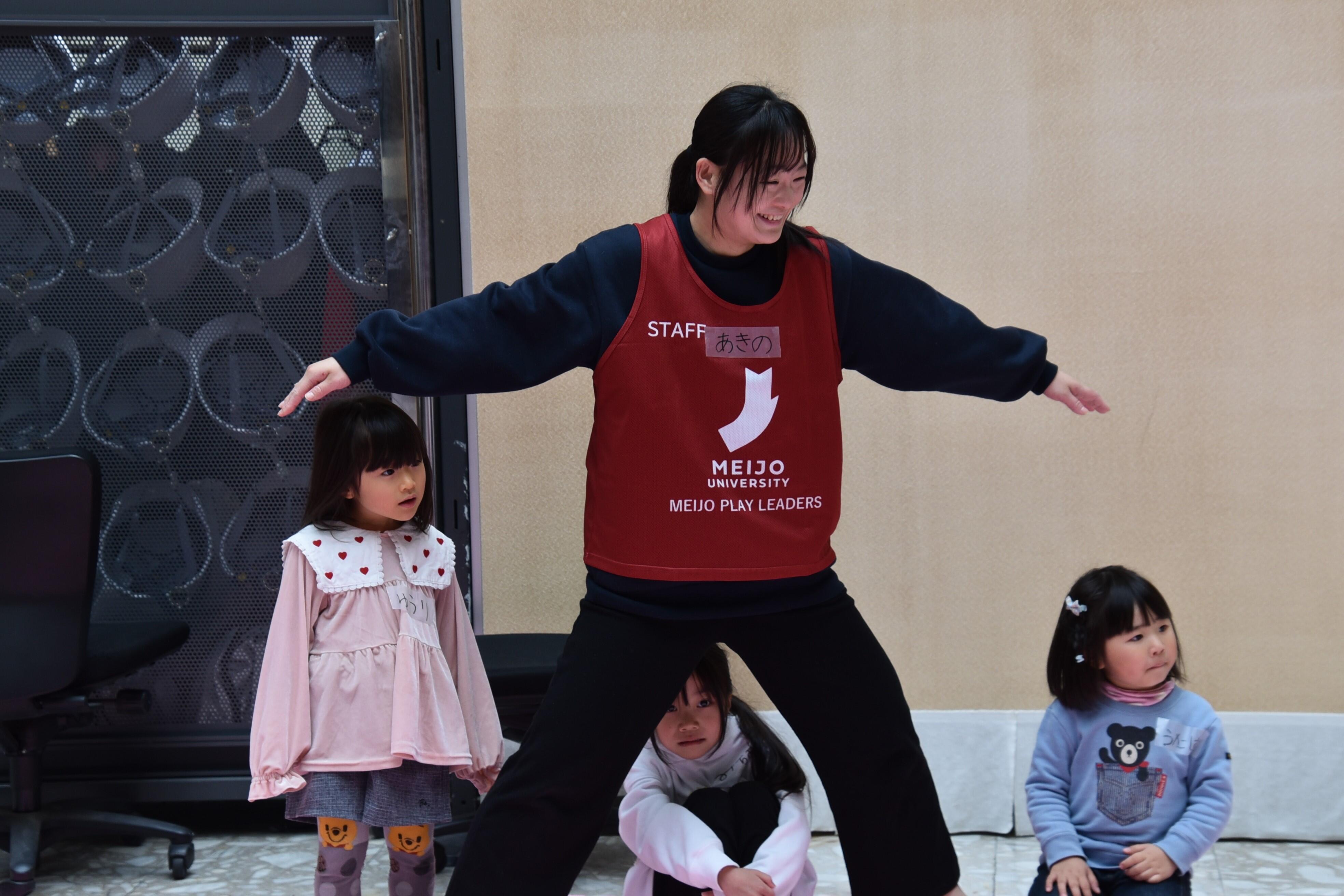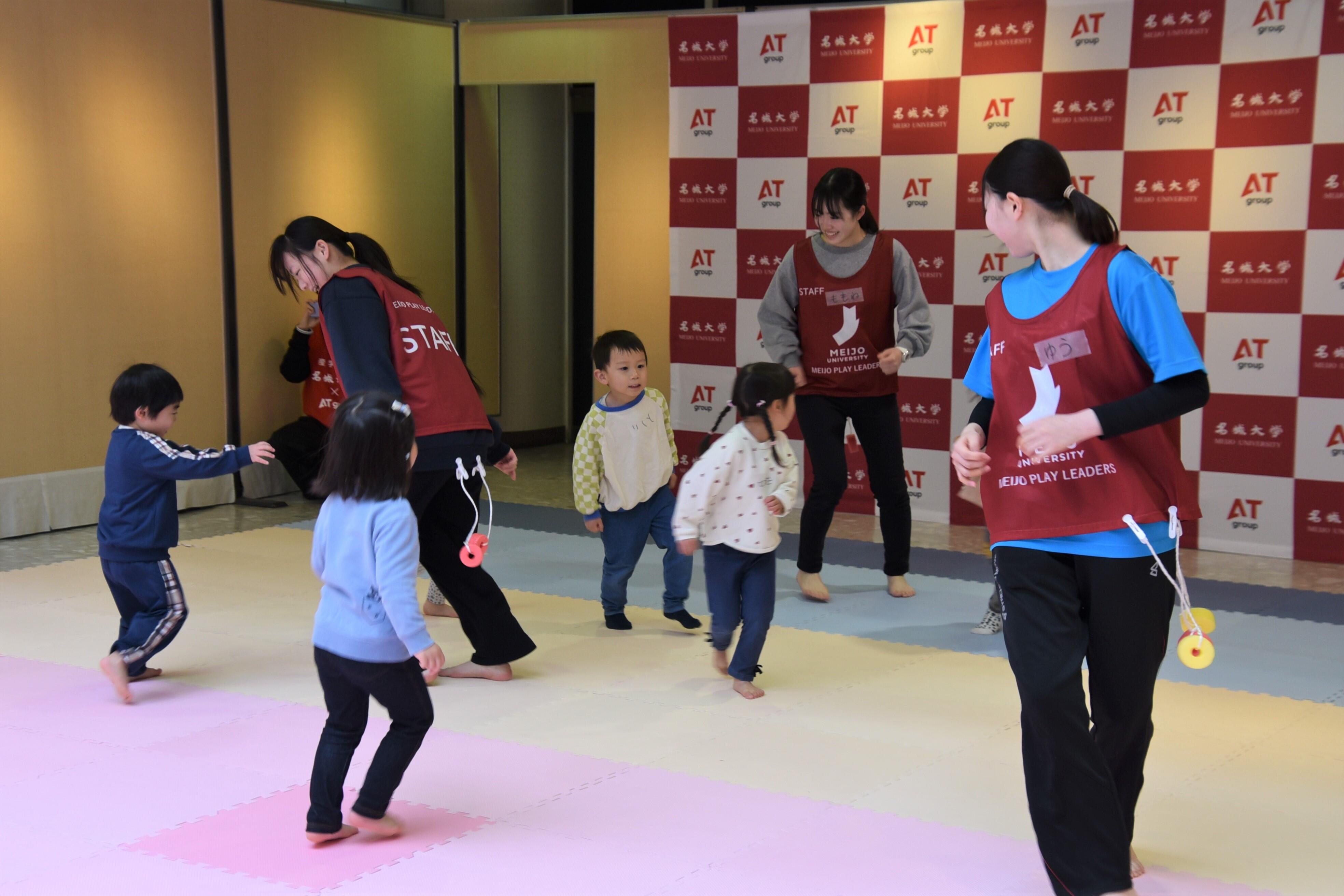 本学と産学連携に関する包括協定を締結している「株式会社ATグループ」(名古屋市)の販売店「愛知トヨタツインカム店」(日進市浅田平子)で2月7日、本学農学部の香村恵介准教授(スポーツ健康科学・発育発達学)と学生団体「Meijoプレイリーダーズ」が指導する「みんなで運動あそび~楽しく生活習慣チェック!~」が開催され、年少から年長までの未就学の子ども約50人が学生たちと一緒に多彩な運動遊びを楽しみました。