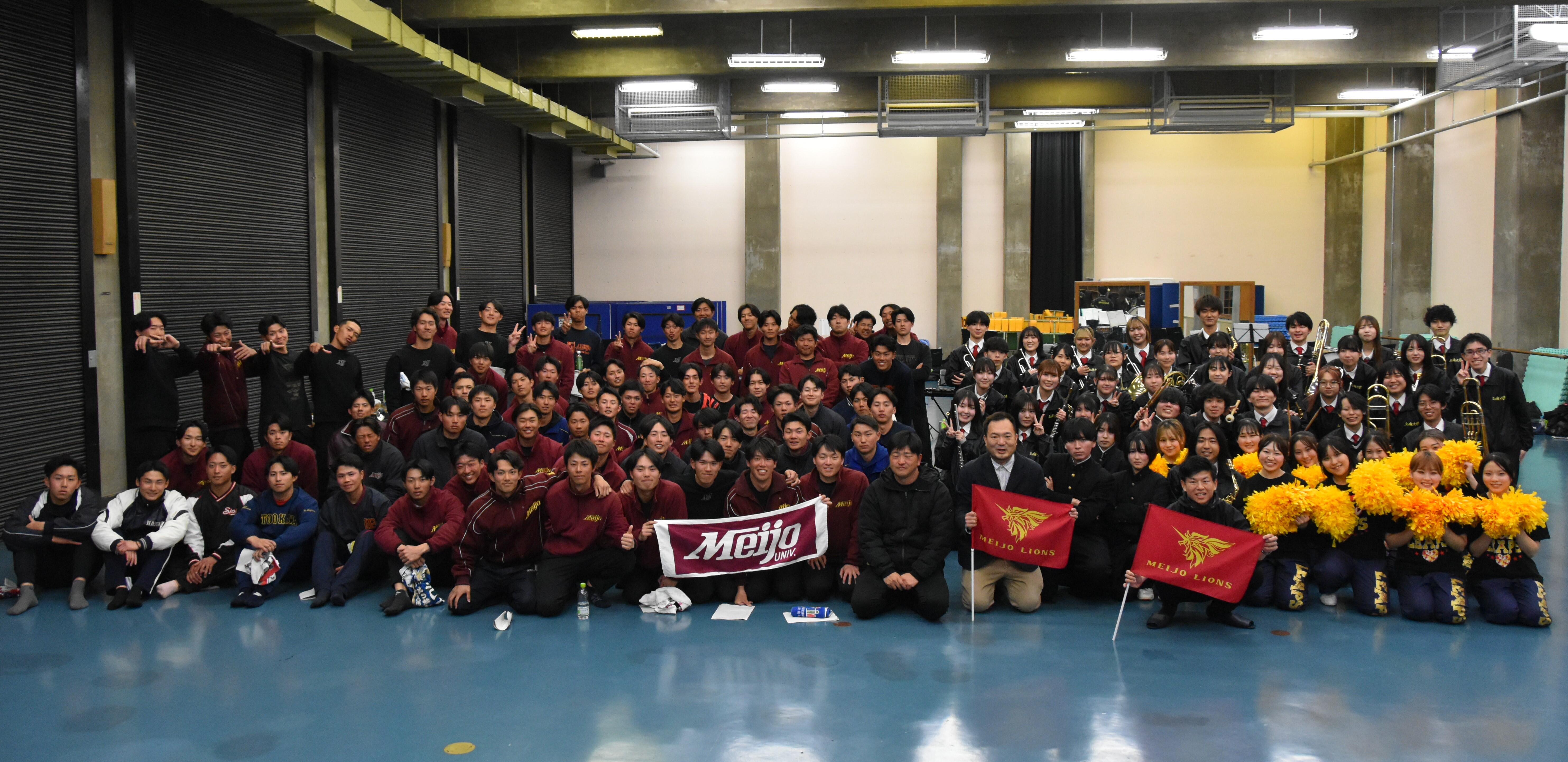 午後には硬式野球部の全部員が合流し、山内壮馬新監督も見守る中、総勢100人を超える合同練習が行われました。応援歌の確認と楽器との連携に加え、楽器の音出しができない野球場でも成立する応援の形を重点的に練習しました。声とリズムで観客を巻き込むよう、アカペラでの歌唱や手拍子、コールの組み立てなど、無楽器パターンを繰り返し確認。舞台を選ばず名城の熱量を届けられる応援体制を整えました。