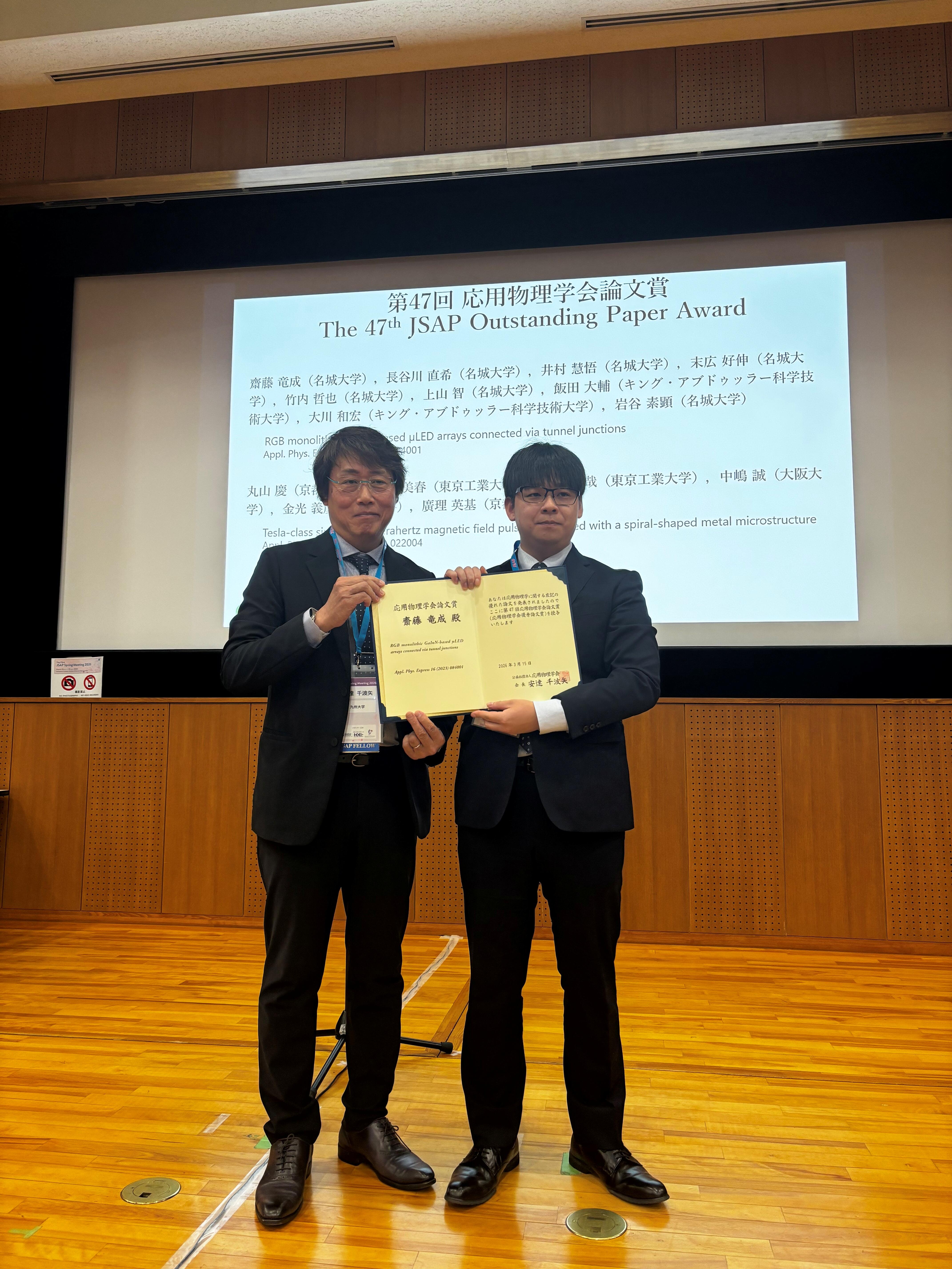 岩谷素顕教授らの研究グループによる論文が、応用物理学分野で国際的に高く評価される応用物理学会第47回論文賞を受賞しました。本研究は、結晶成長によりトンネル接合構造を用いた積層型モノリシックμLEDアレイを世界で初めて実現した画期的成果であり、次世代ディスプレイやAR/VR光源への応用が期待される世界的な研究成果として高く評価されました。授賞式では、本論文のFirst authorである齋藤竜成さんが、代表して応用物理学会会長の安達千波矢先生より表彰を受けました(写真)。また、3月15日の午後に30分の受賞記念講演を行い、多くの聴衆から絶賛する声を多数いただくことができました。 |