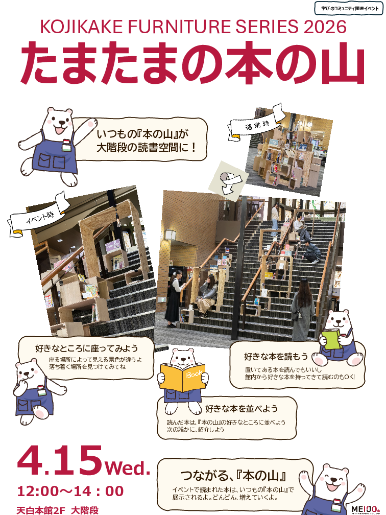 トップページ/ニュース 【イベントのお知らせ】第1回目「たまたまの本の山」~KOJIKAKE FURNITURE SERIES2026~ 谷田研究室×附属図書館