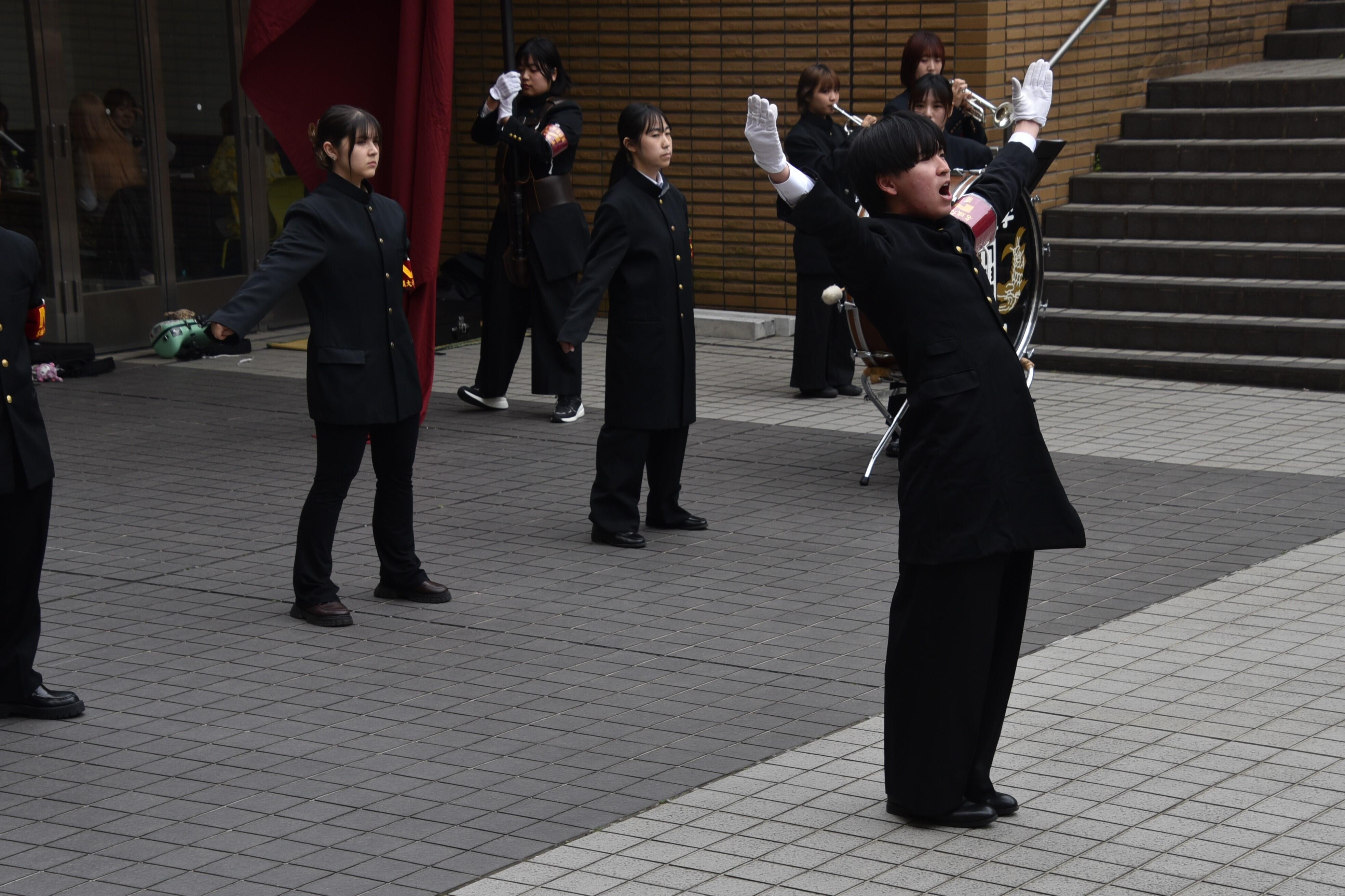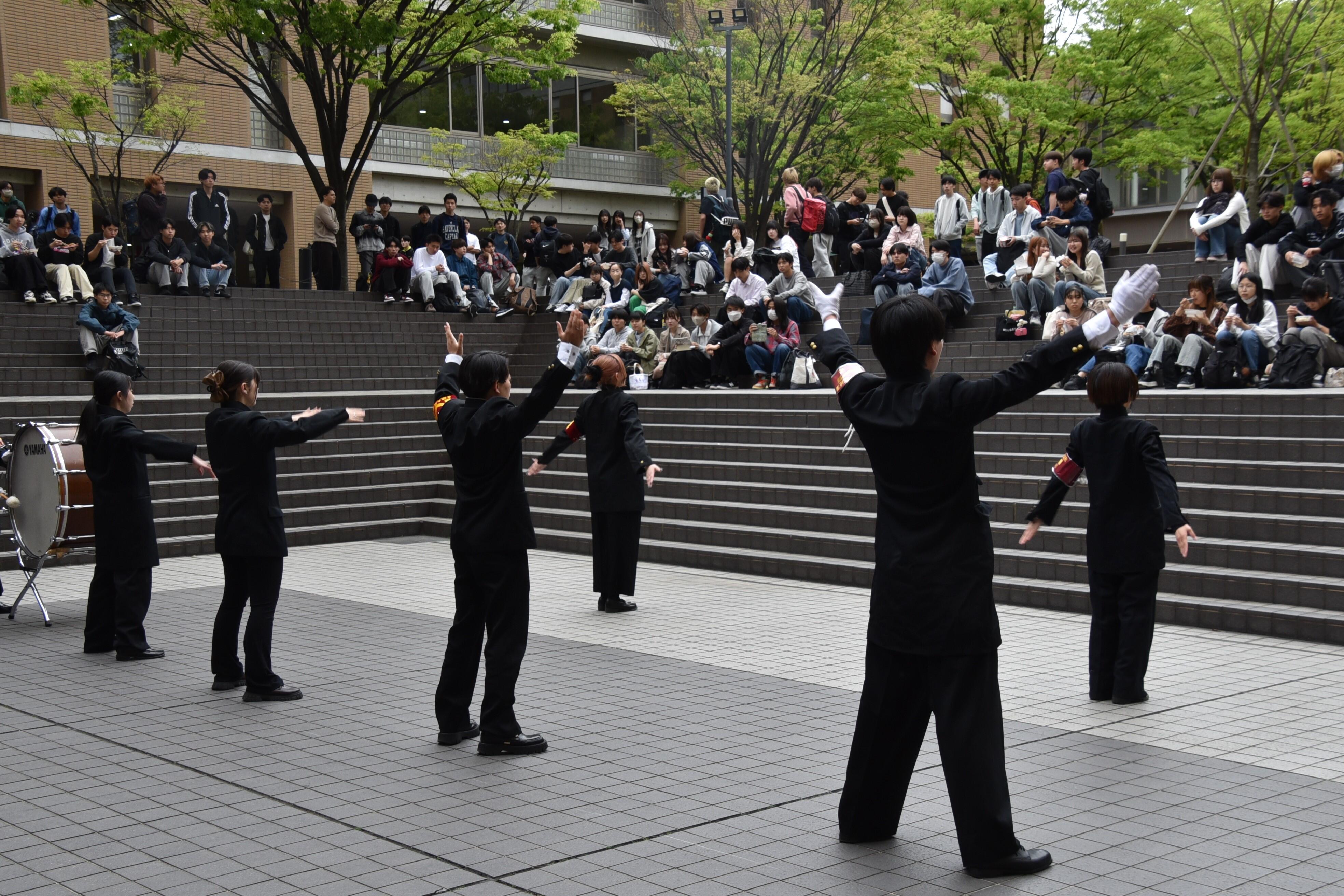 タワー75の1階サンクンガーデンでは5月18日までの土・日曜日を除くほぼ連日、昼休みの12:30~13:00に各クラブの演舞が行われています(雨天時は中止になることもあります)。4月13日には應援團リーダー部が学歌や応援歌に合わせて気合に満ちた迫力ある応援を披露すると、熱心に見入っていた学生たちから盛んな拍手が送られていました。