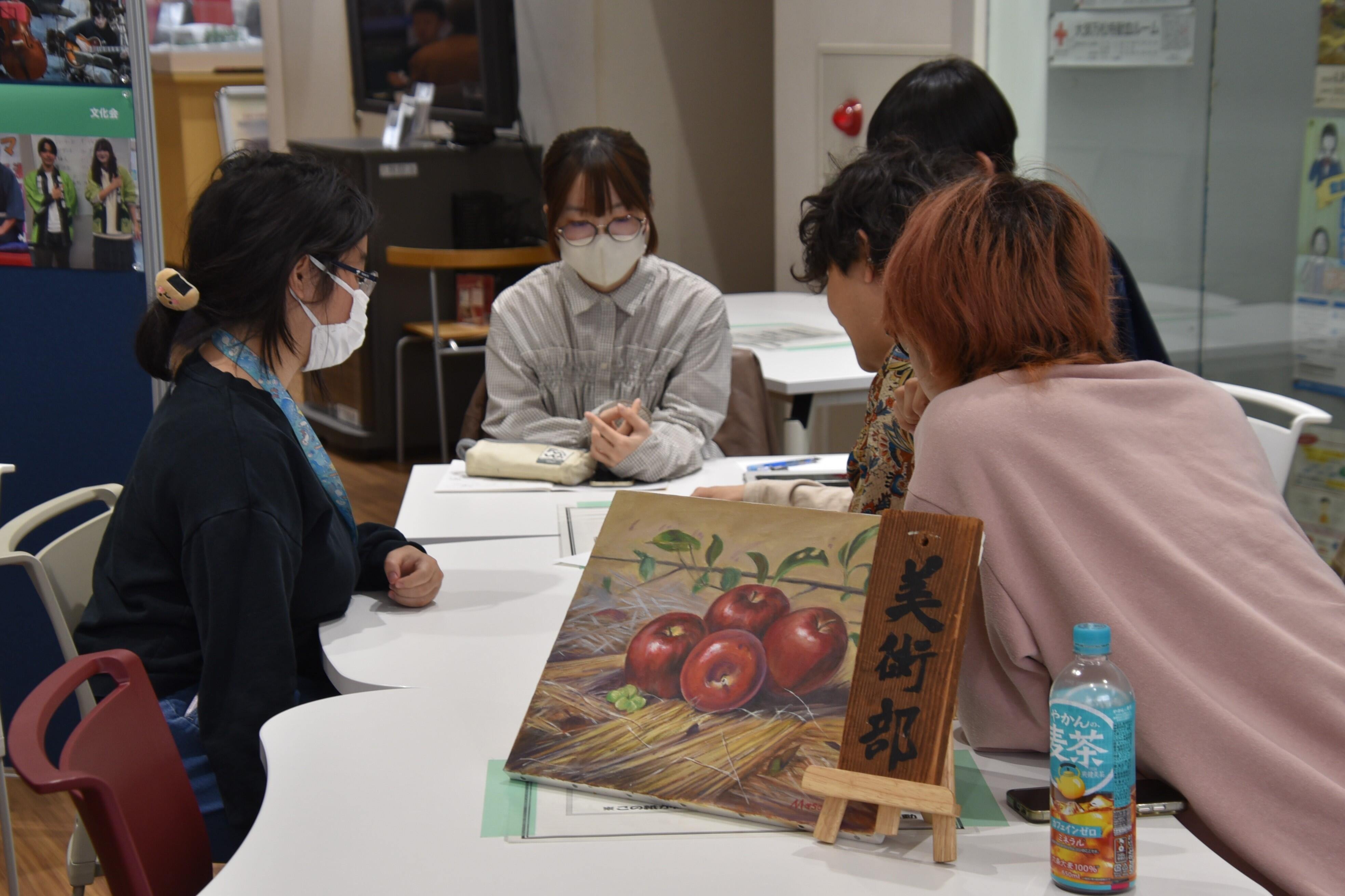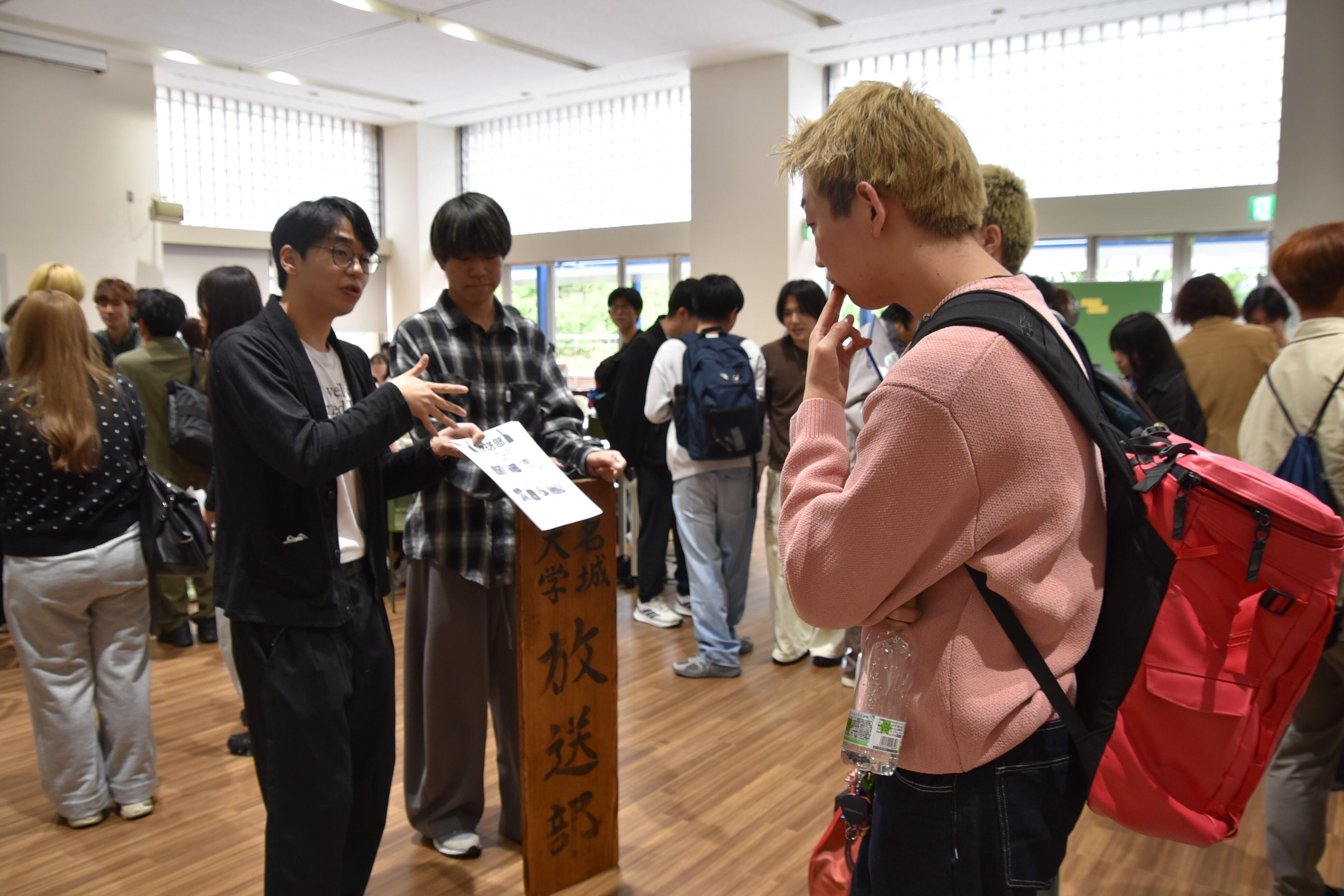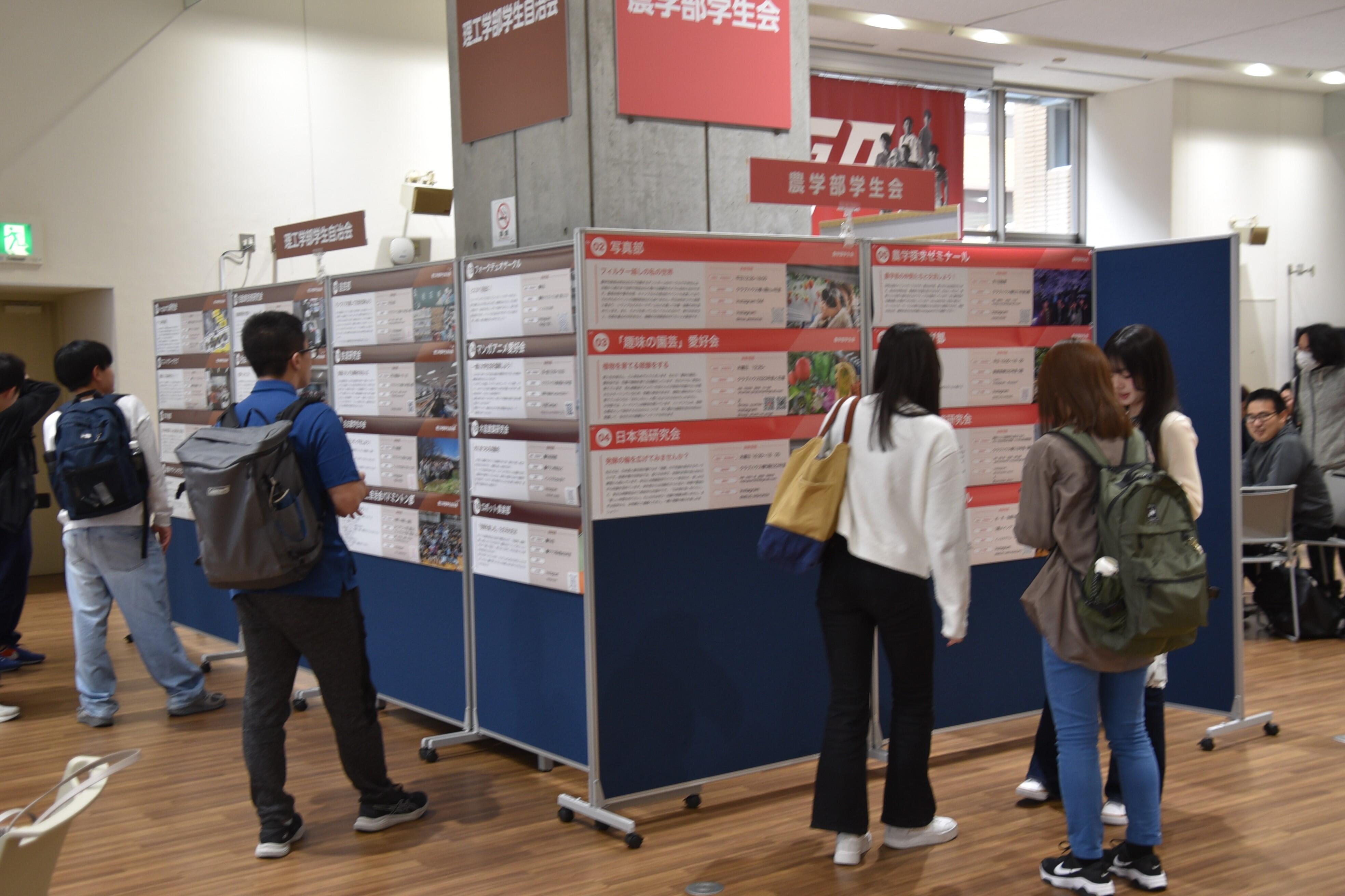 また、タワー75の2階学生ホールでは4月24日までの月曜日から金曜日に先輩たちに直接、質問ができるクラブごとの勧誘ブースが設けられ、活動の日時や内容などを質問する新入生でにぎわっています。さらに、各クラブの連絡先やSNS情報などがまとめられた掲示板前でも友人同士で話し合う1年生の姿が見られます。