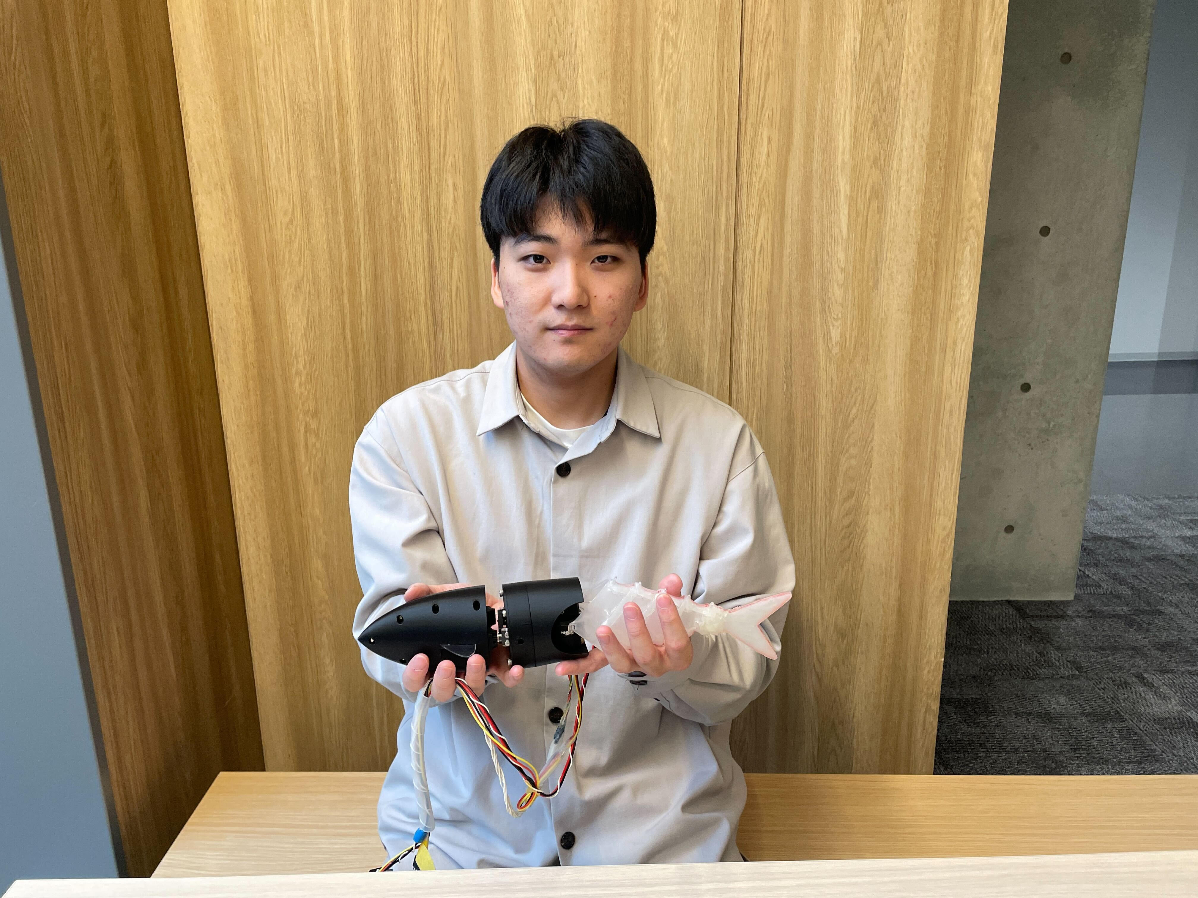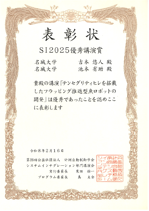 2025年12月10日~12日に開催された第26回計測自動制御学会システムインテグレーション部門講演会(SI2025)で発表した、「テンセグリティ・ヒレを搭載したフラッピング推進型魚ロボットの開発」 が優秀講演賞として受賞されました。SI2025における優秀講演賞はすべての発表(1290件)の中から、優秀と認められた発表に授与されます。 本発表では、イワシと同程度の大きさの水中移動ロボットを開発しました。本ロボットは、棒と弾性体でできたテンセグリティ構造を用いて、魚のヒレの骨と組織を模倣し、1つのモータで自然な泳ぎを実現しています。さらに,バッテリーやマイコンを搭載し、赤外線通信による無線遠隔操作が可能です。 本研究では、魚に近い形状を持つロボットを用いることで、養殖環境において魚への影響を抑えながら状態をモニタリングすることを目指しています。 |