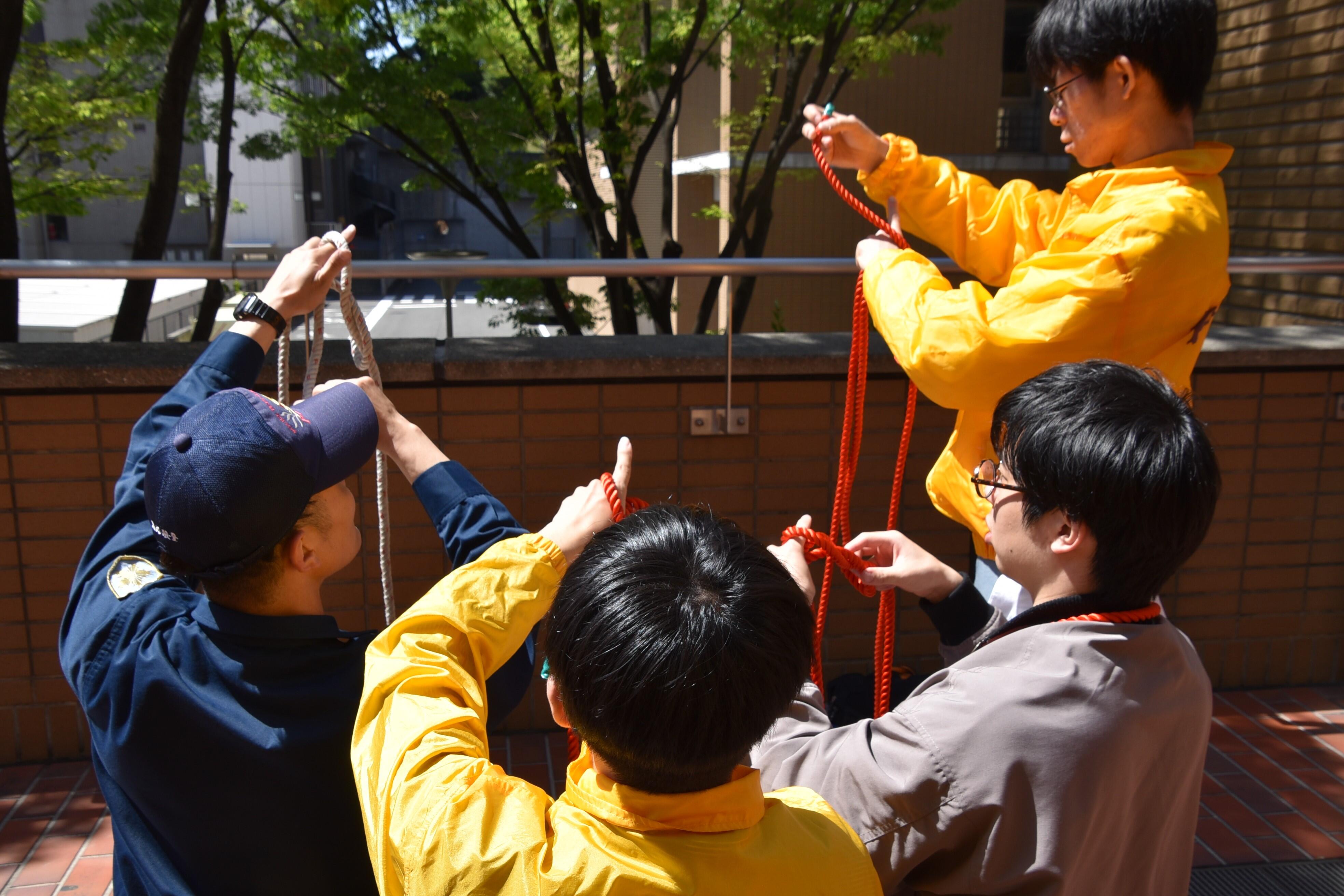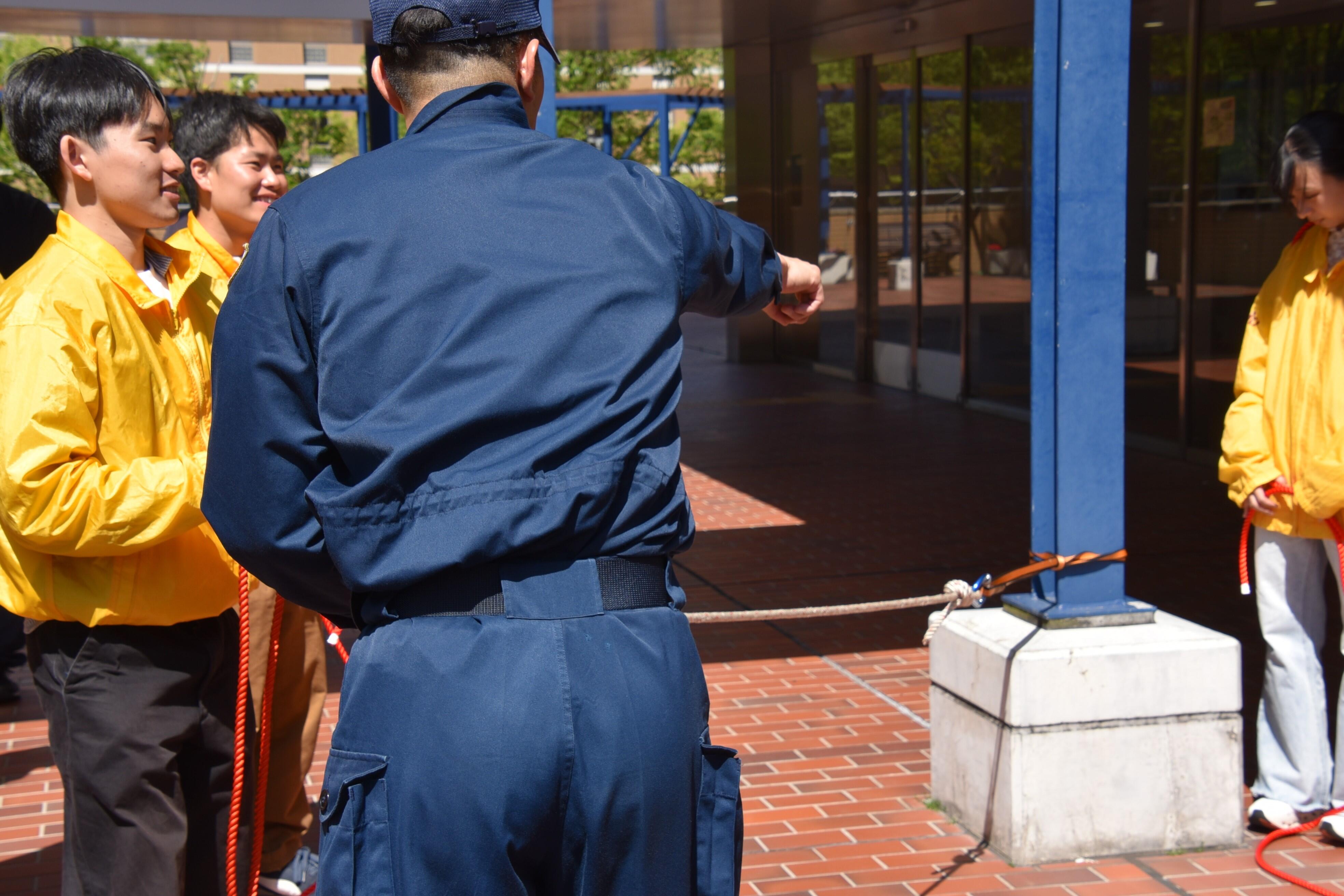 この日は学生約20人が参加し、ロープを使った人命救助や能登半島地震の被災地での活動など、災害救助の経験が豊富な署員から、「本結び」「もやい結び」「体もやい結び」「二重継ぎ」「蝶結び」の5種類のロープの結び方について、正しい手順やポイント、それぞれの結び方の特徴や有効な用途などを、約1時間にわたって教えてもらいました。
