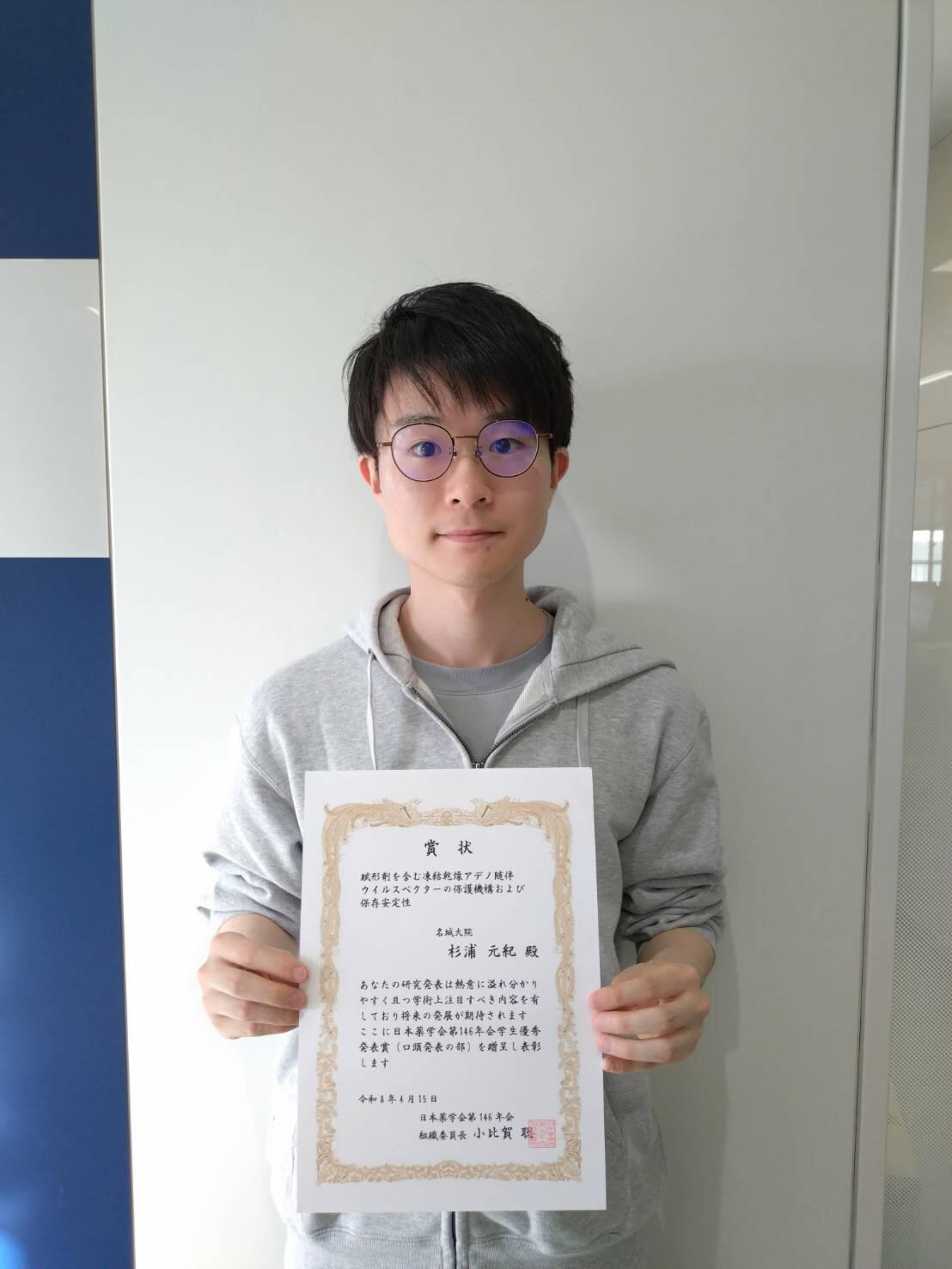 本賞は、学部学生および大学院生の発表者を対象として、一般学術発表 (口頭発表) の中から特に優秀なものを選出し、授与するものです。第146年会は関西大学千里山キャンパス (吹田市) で開催されました。 本研究では、遺伝子治療に用いられるアデノ随伴ウイルスベクター (AAVV)について、凍結乾燥後も活性を保持可能な賦形剤が、凍結乾燥ストレスから AAVVを保護するメカニズムを解明しました。また、保存安定性に乏しい AAVVを前述の賦形剤を用いて、凍結乾燥法または噴霧急速凍結乾燥法により粉末製剤化することで、AAVV液剤よりも高い保存安定性が得られ、長期保存が可能となることを実証しました。これらの成果から、AAVVを用いた遺伝子治療製剤のさらなる発展・普及が期待されます。 本受賞は、昨年度の日本薬学会第145年会 (福岡) に引き続き、2年連続での受賞となります。また、杉浦元紀さんは4月より、薬物動態制御学研究室の特任助教として研究を続けています。 |