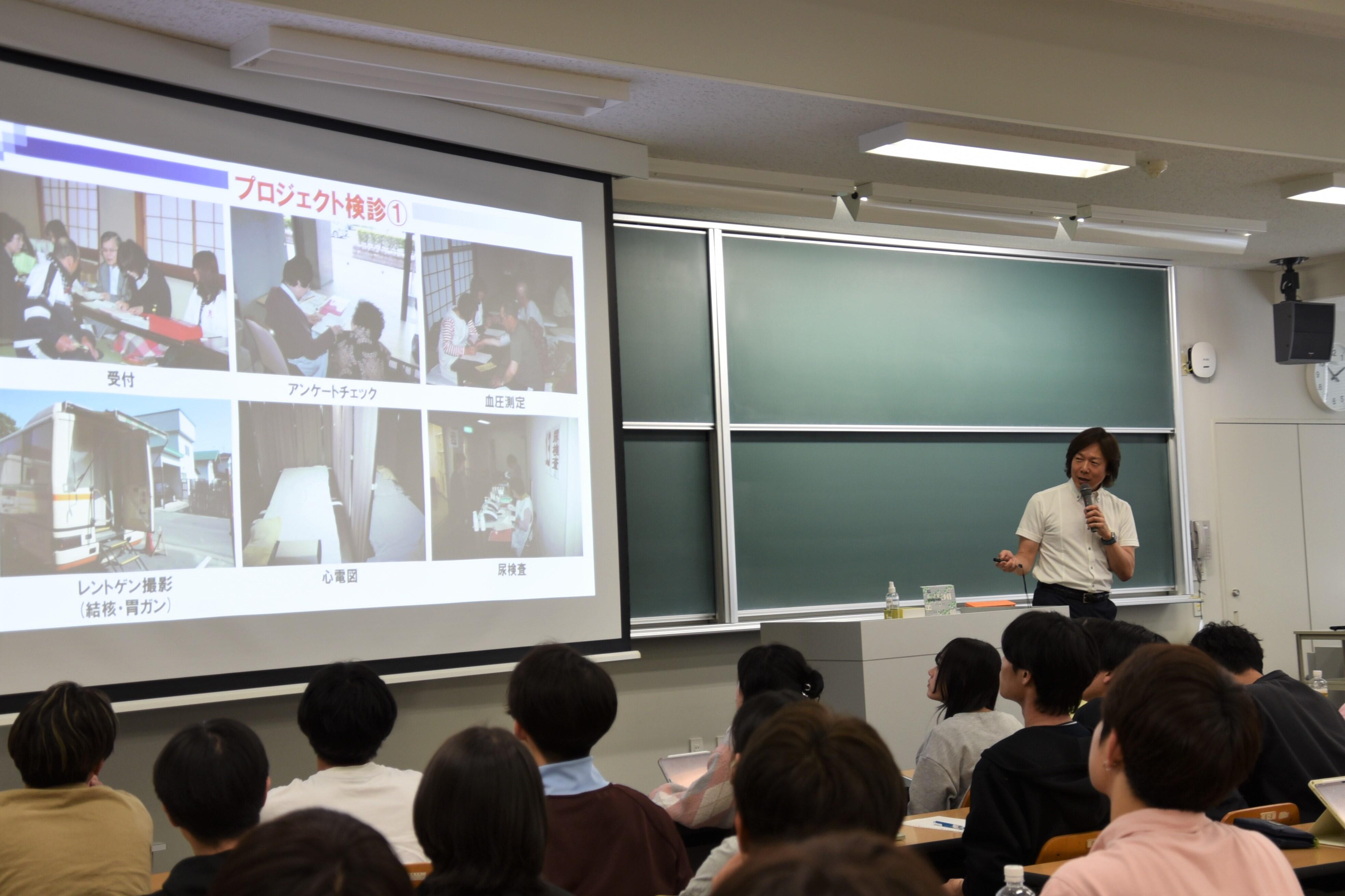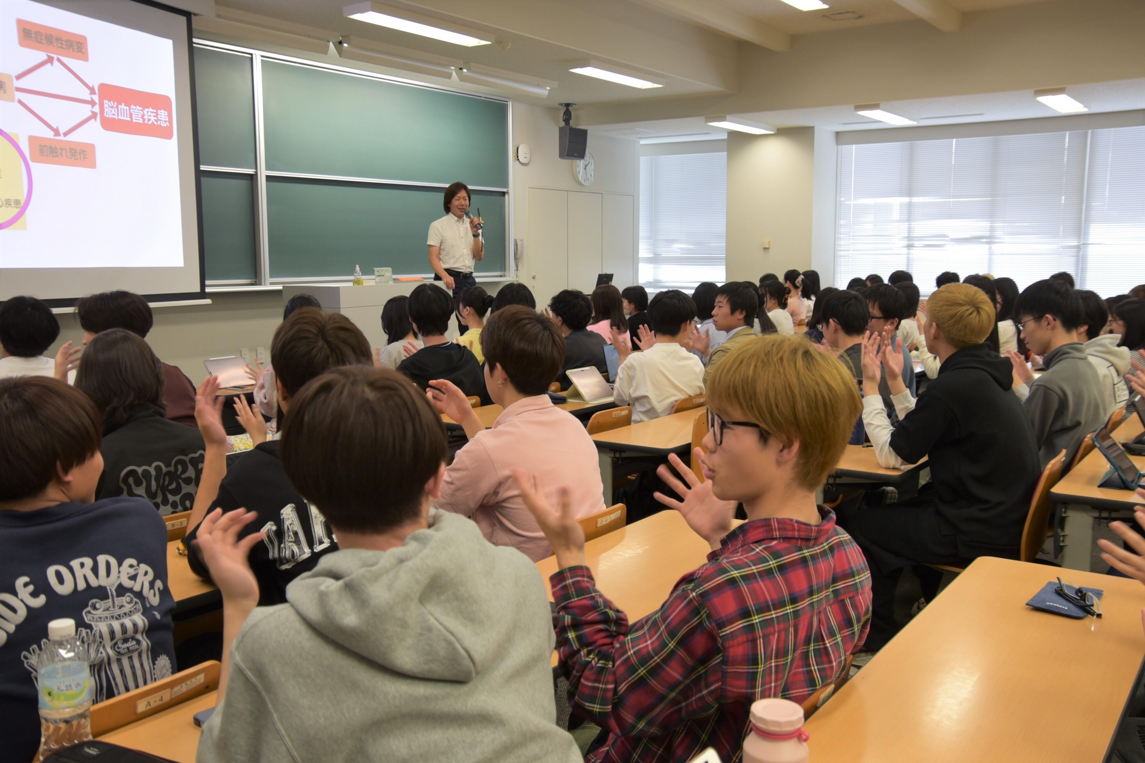 佐藤特任教授は初めに、2024年6月に脊髄梗塞を発症し、現在も股関節から下がしびれていて、発症翌日から始めたリハビリを今も続けていることを明かし、脊髄梗塞の原因は不明で治療法もなく、難病指定もされていない現状を説明。学生たちに「早期発見がすごく大事で、皆さんの周りに病名が分からない病気で苦しんでいる人がいたら、神経系の医療や検査を受けるように伝えてください」と呼び掛けました。