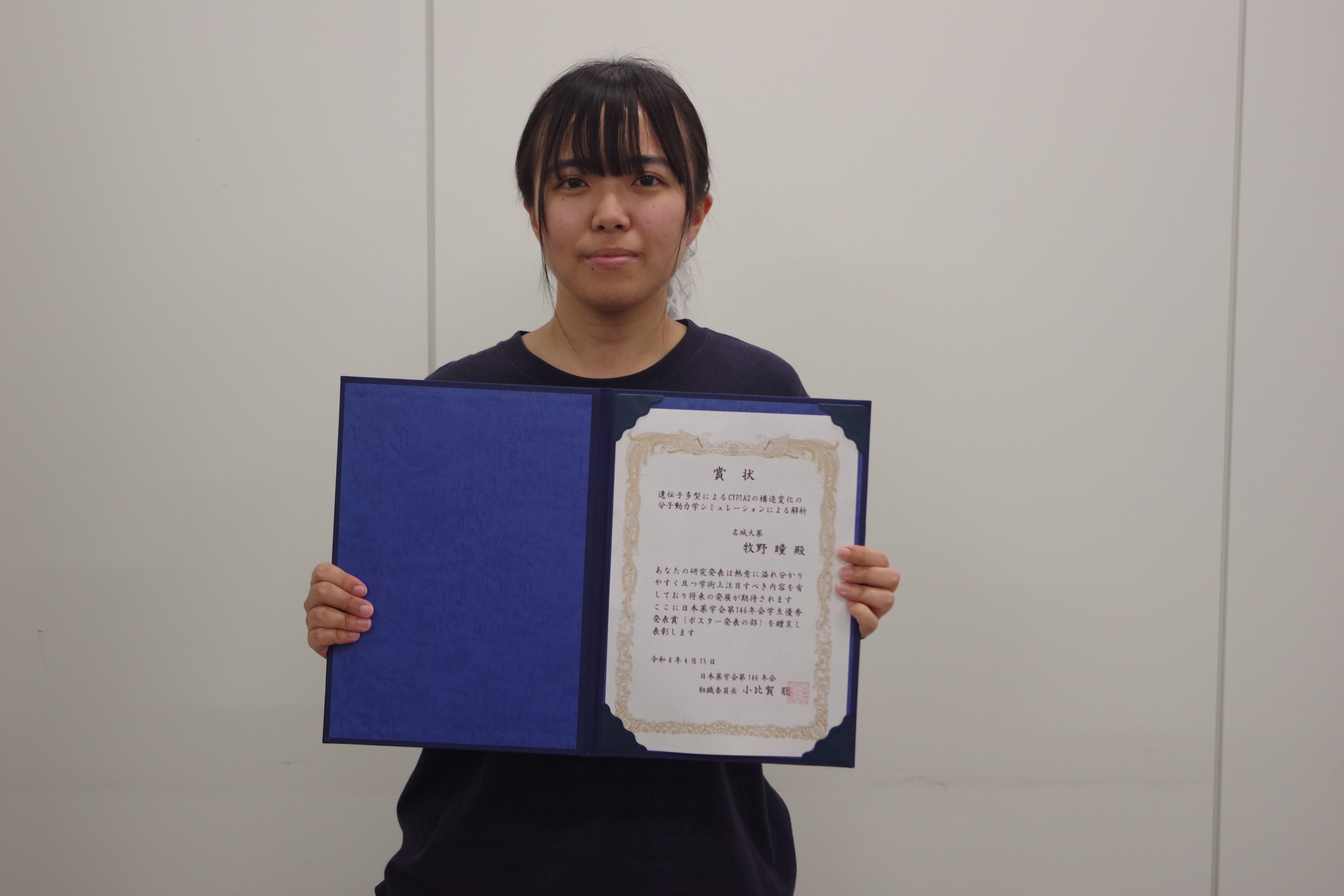 トップページ/受賞 薬学部の牧野瞳さんが日本薬学会ポスター発表の部で学生優秀発表賞を受賞