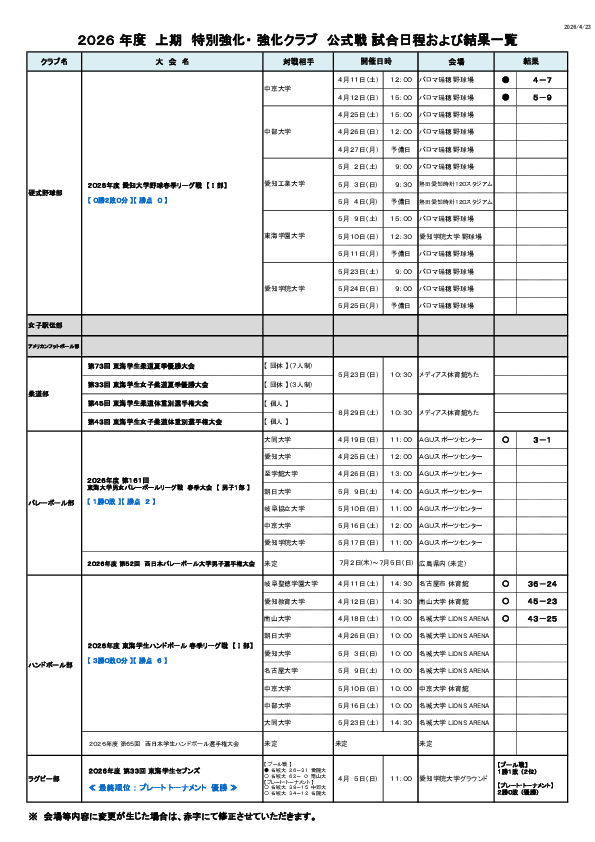 特別・強化クラブの4月18日、19日の試合結果と4月25日~27日の試合予定です。