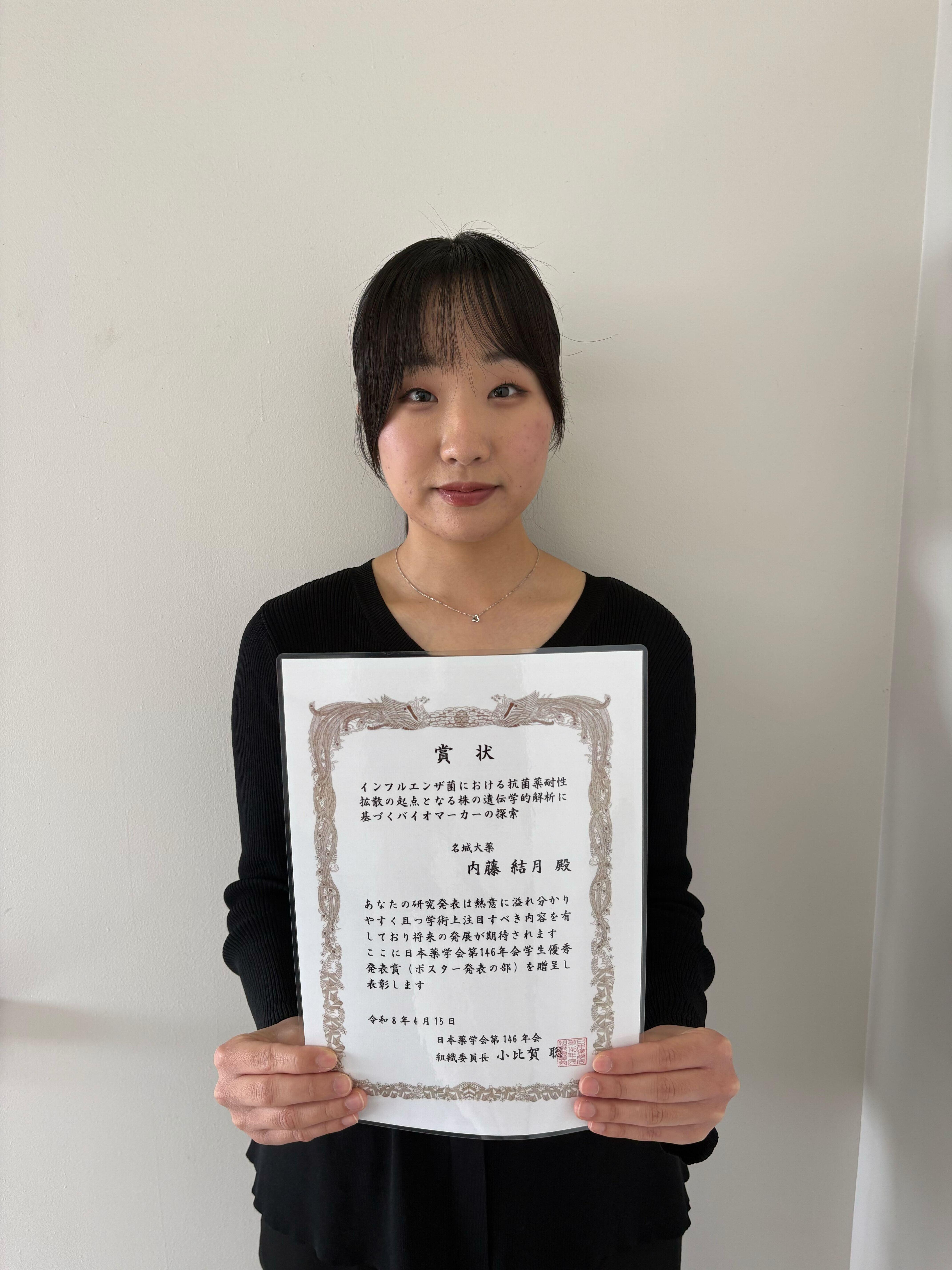 トップページ/受賞 薬学部の内藤結月さんが日本薬学会ポスター発表の部で学生優秀発表賞を受賞