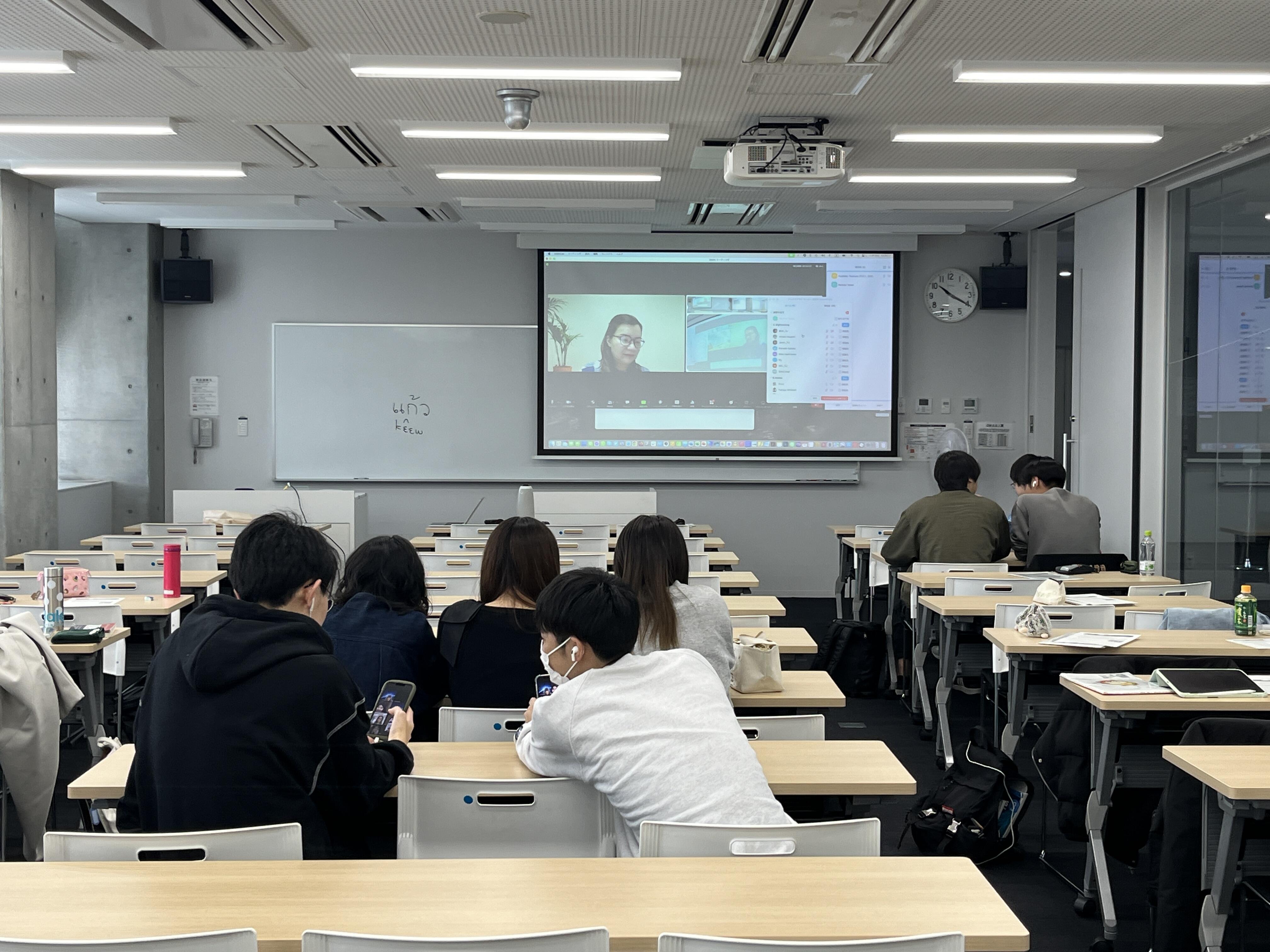 2023年11月15日に、授業「タイの言語と文化II」などの学生14名が、タイのタマサート大学ランパーン校の社会福祉学部の学生15名とオンライン交流を行いました。インターネットを通じて世界の大学生と協働学習を実践するプログラム、CLAB(Collaborative Learning Across Borders)の取り組みの一つです。11月3日に引き続いてですが、今回は3年生の学生が主に参加してくれました。