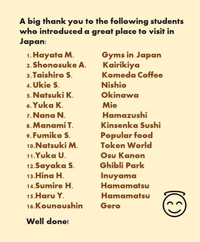 We invited the international students to come to our Global Plaza (October 2nd from 12:30 p.m.) and we introduced to them 'great places to visit in Japan'.