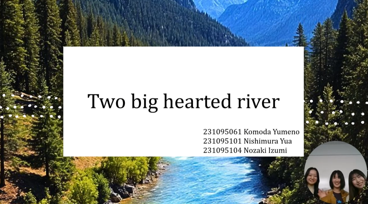 後期はヘミングウェイの短編小説からの4作品、「医師とその妻」("The Doctor and The Doctor’s Wife")、「ある決別」("The End of Something")、「身を横たえて」("Now I Lay Me")、「二つの心臓の大きな川 第一部、第二部」("Big Two-Hearted River I, II") を4グループで分担し、精読した。今回は作中の自然描写を分析し、物語にどのような効果をもたらしているかについて考察し、プレゼンテーション発表をした。