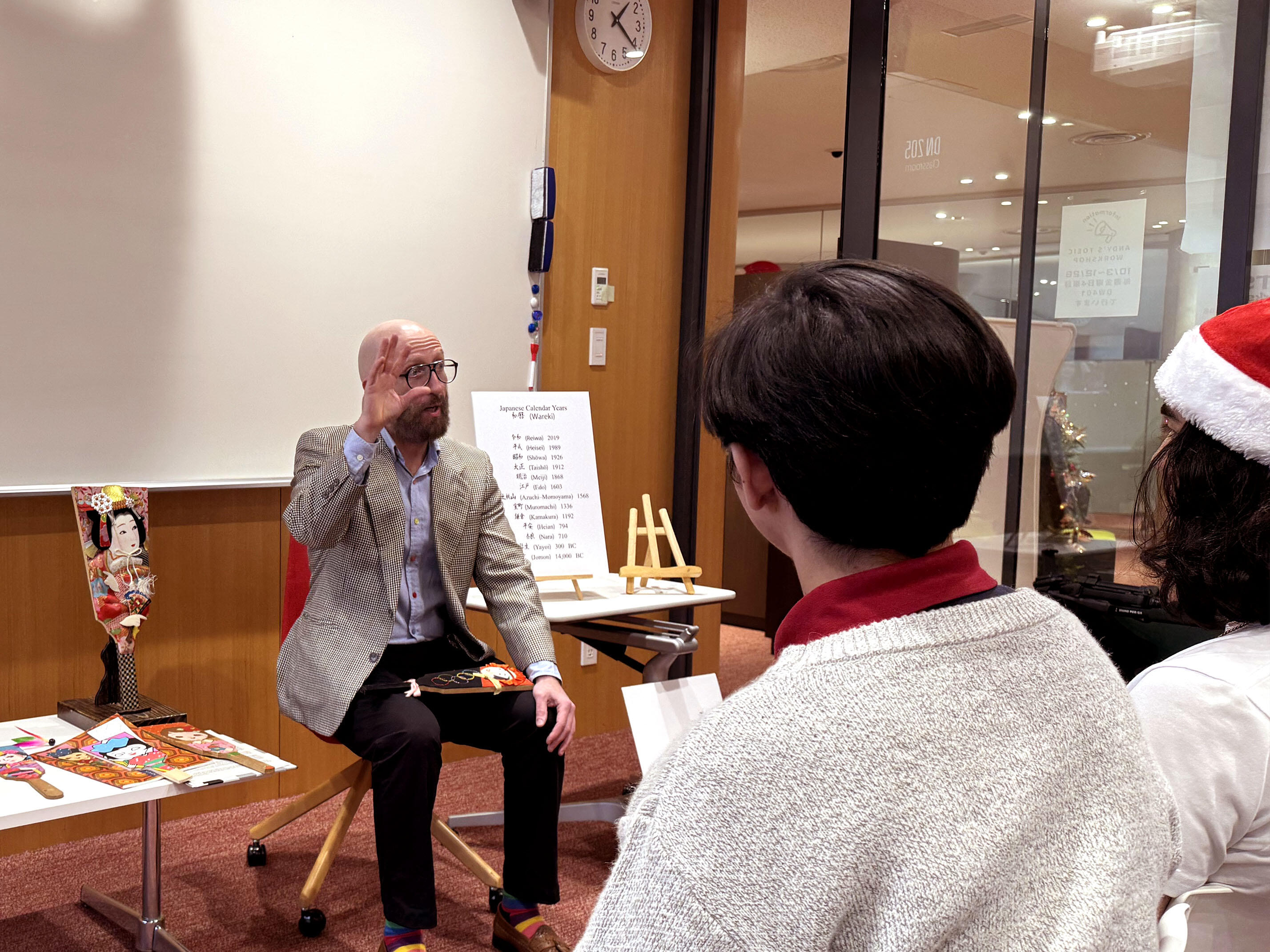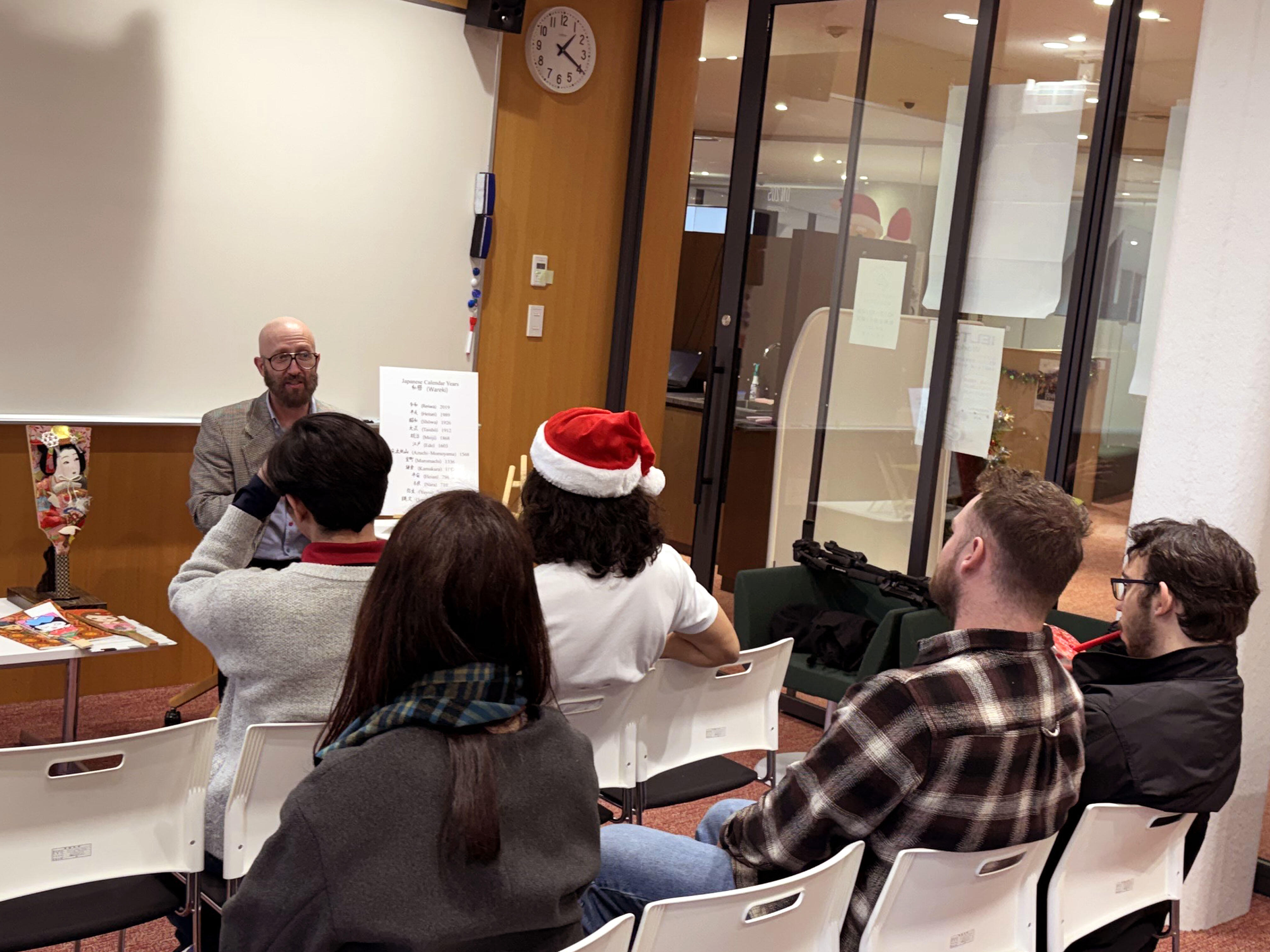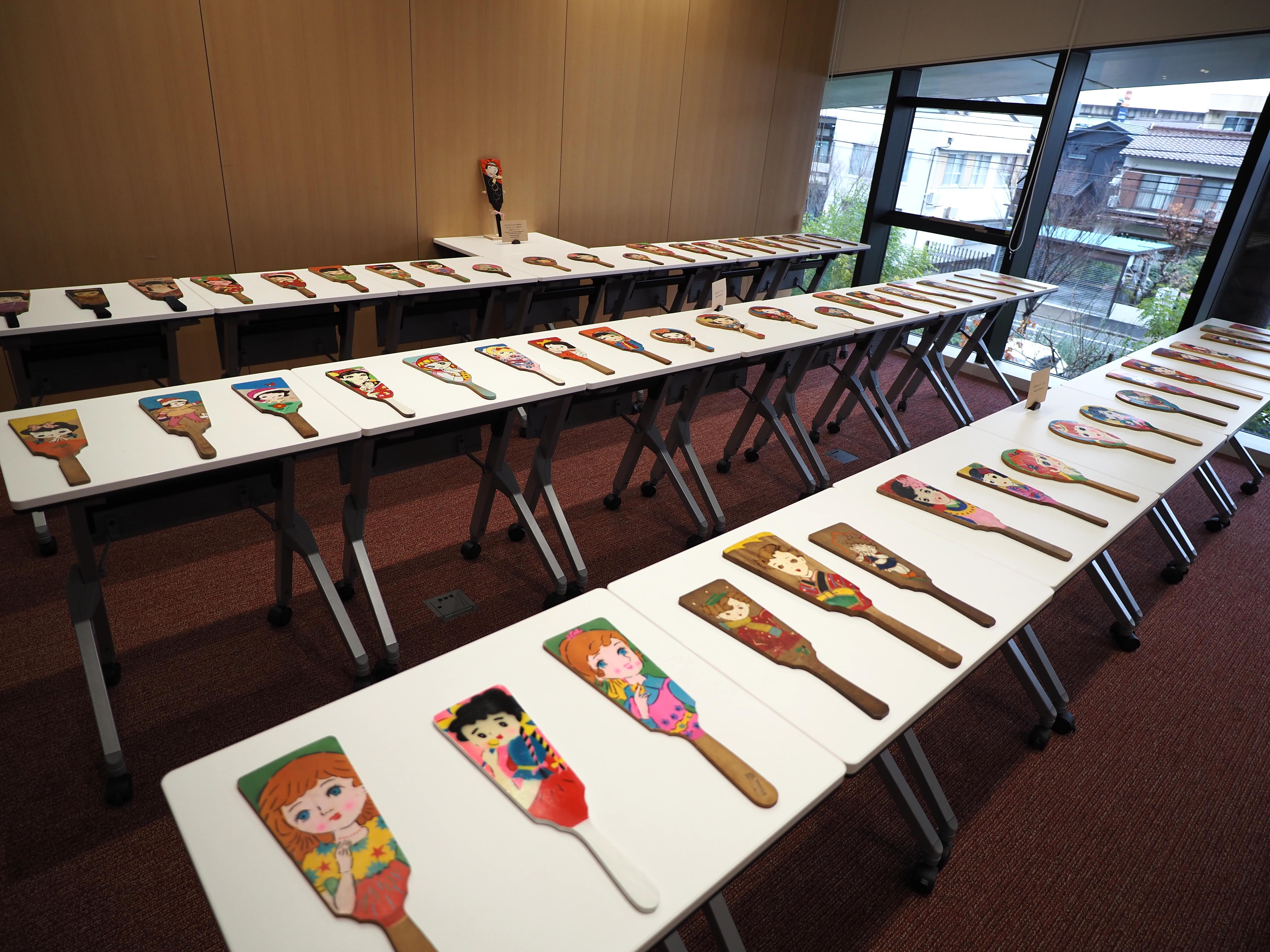 On December 25, 2025 at the Global Plaza, Professor Rogers of the Faculty of Foreign Studies delivered a special lecture to foreign exchange students on Showa-era hagoita and the cultural history surrounding them. The event featured an exhibition of more than fifty vintage Showa hagoita, including an exceptionally rare 1940 Tokyo/Sapporo "Lost Olympics" commemorative hagoita.