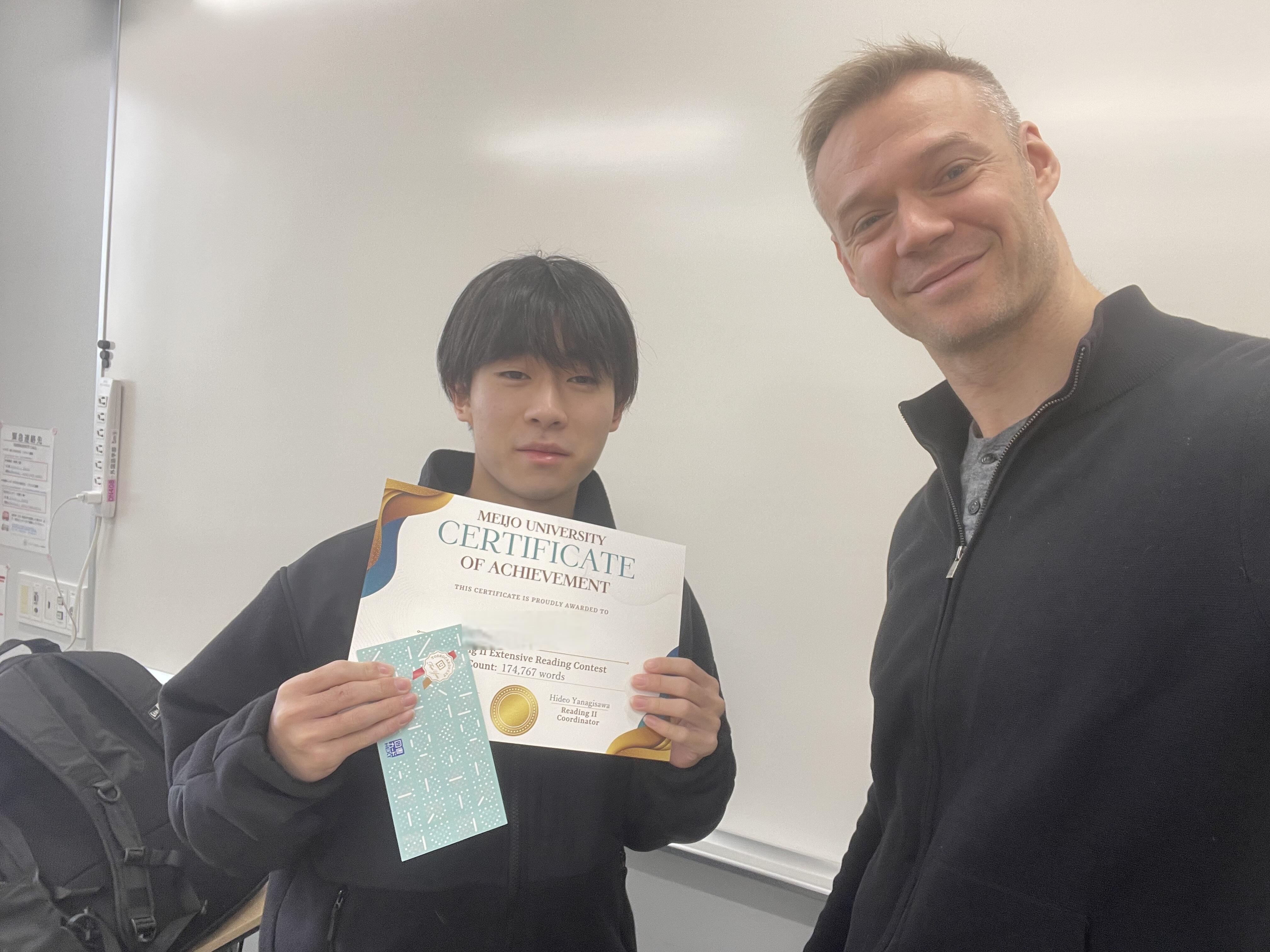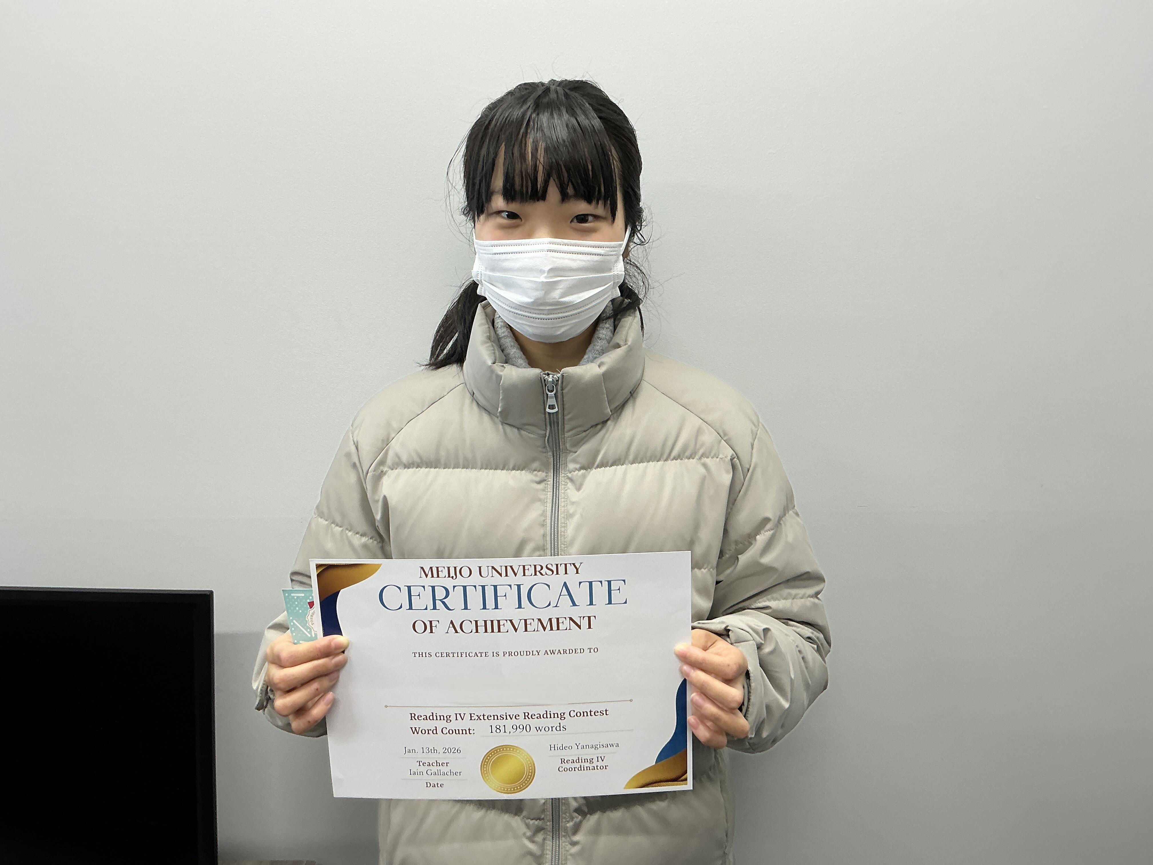 MReaderによる英語図書多読プログラム (ER: Extensive Reading)で2025年度後期でもっとも多くのワード数を読んだ学生がEnglish Reading II、IV、Vの3コースで表彰され、賞状と図書カード(3000円)が贈呈されました。