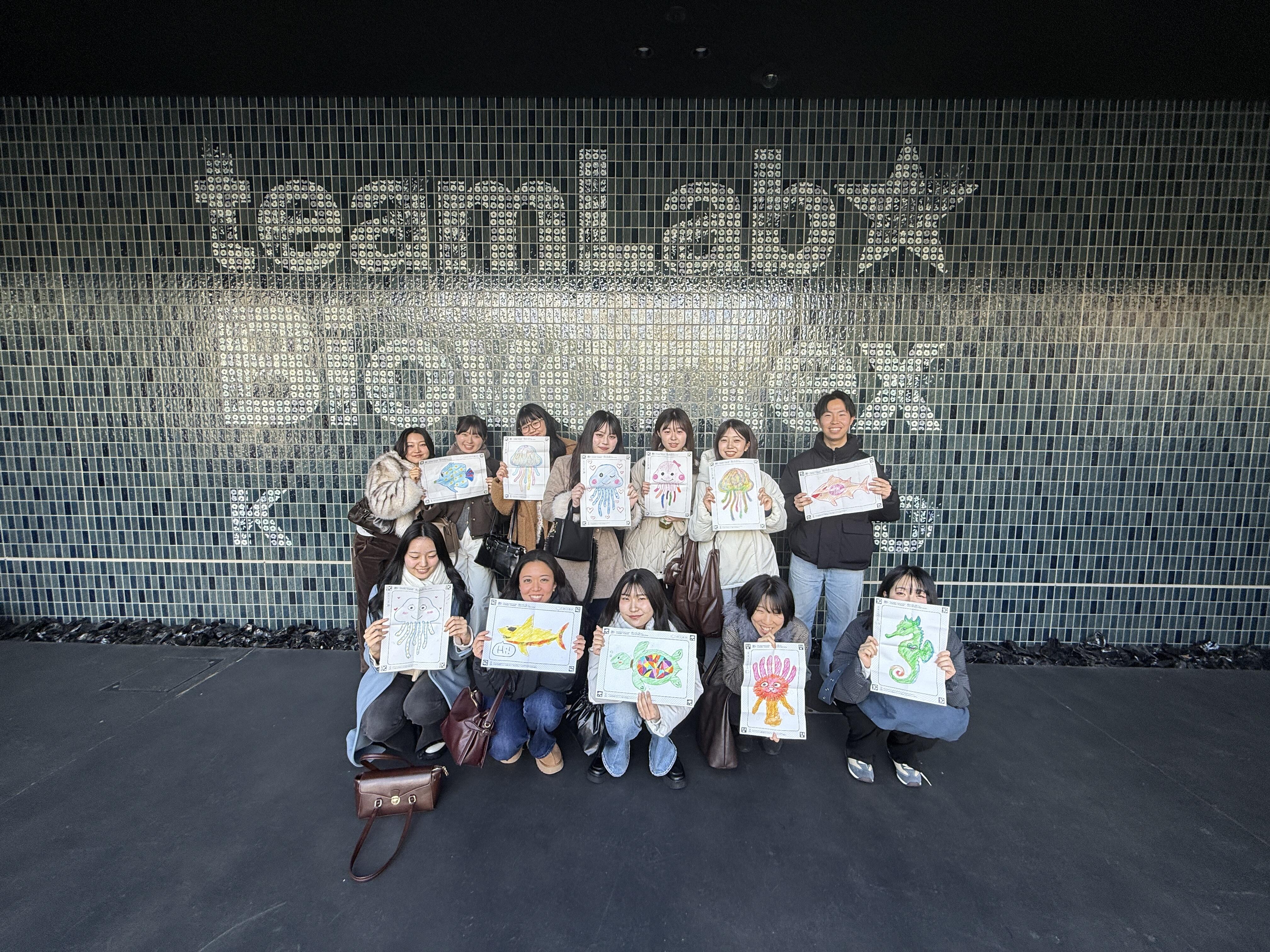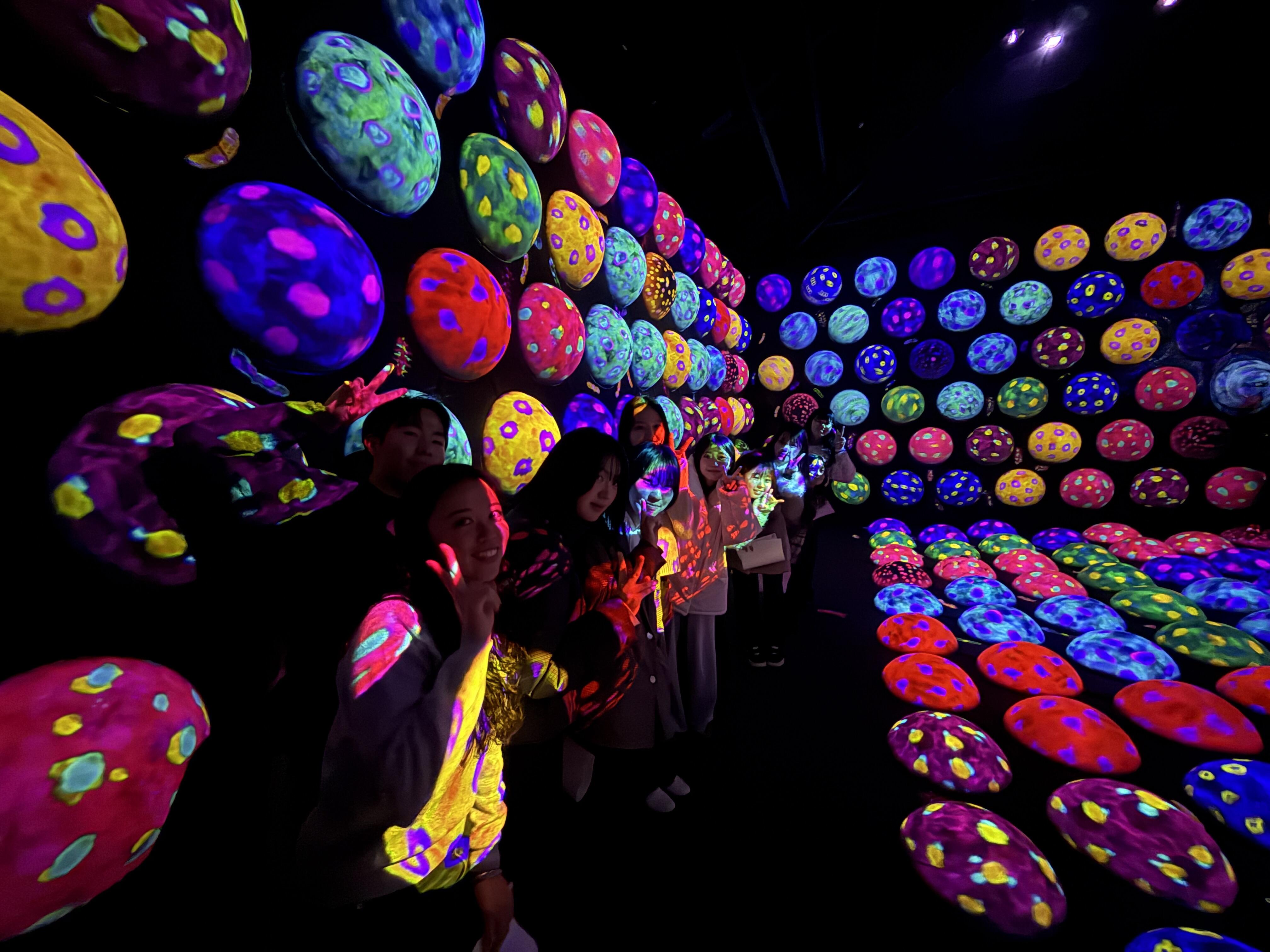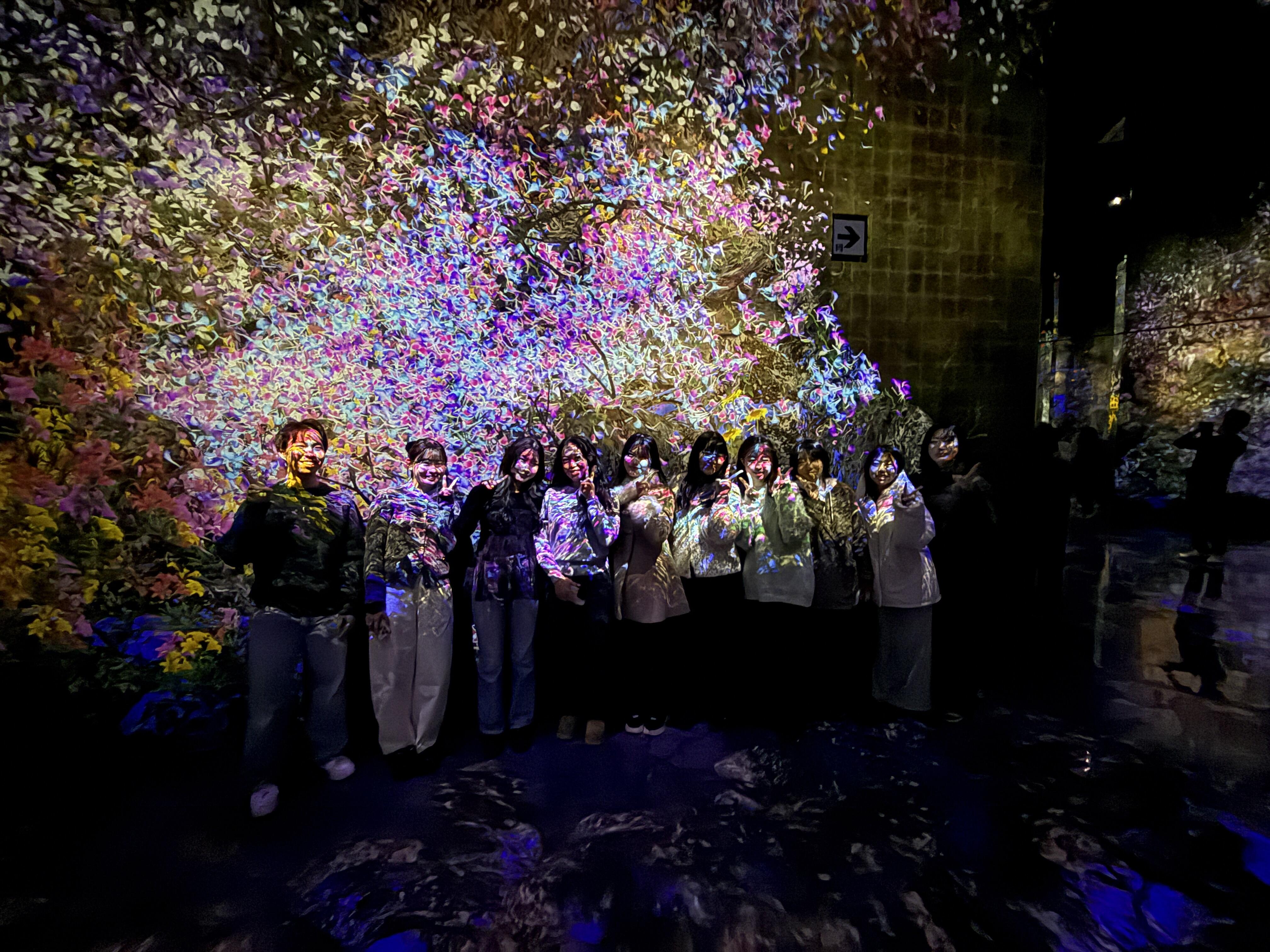 初日は8:30に京都駅へ集合。午前中は京都に新設された「チームラボ」を視察し、最先端の映像テクノロジーを用いたエンターテインメントの最前線を肌で感じました。