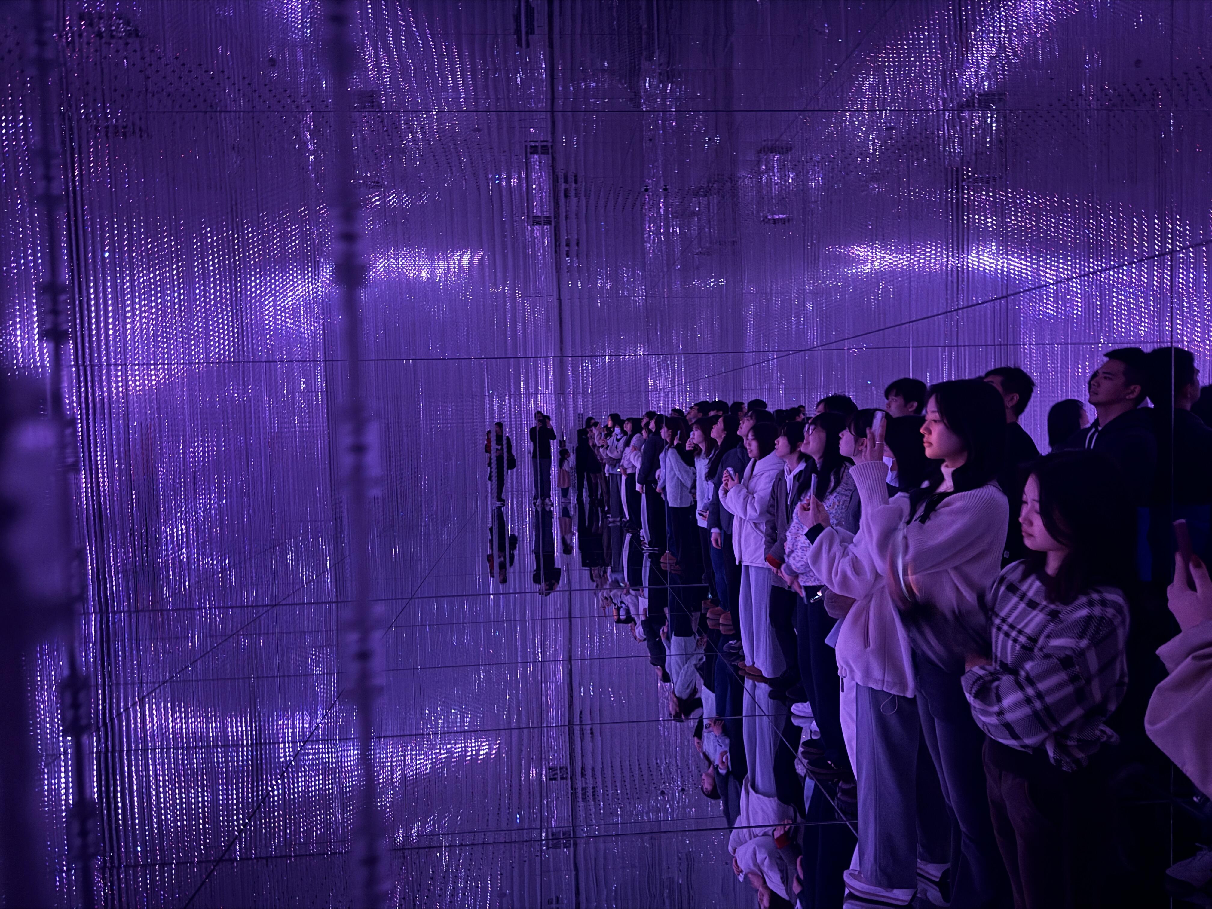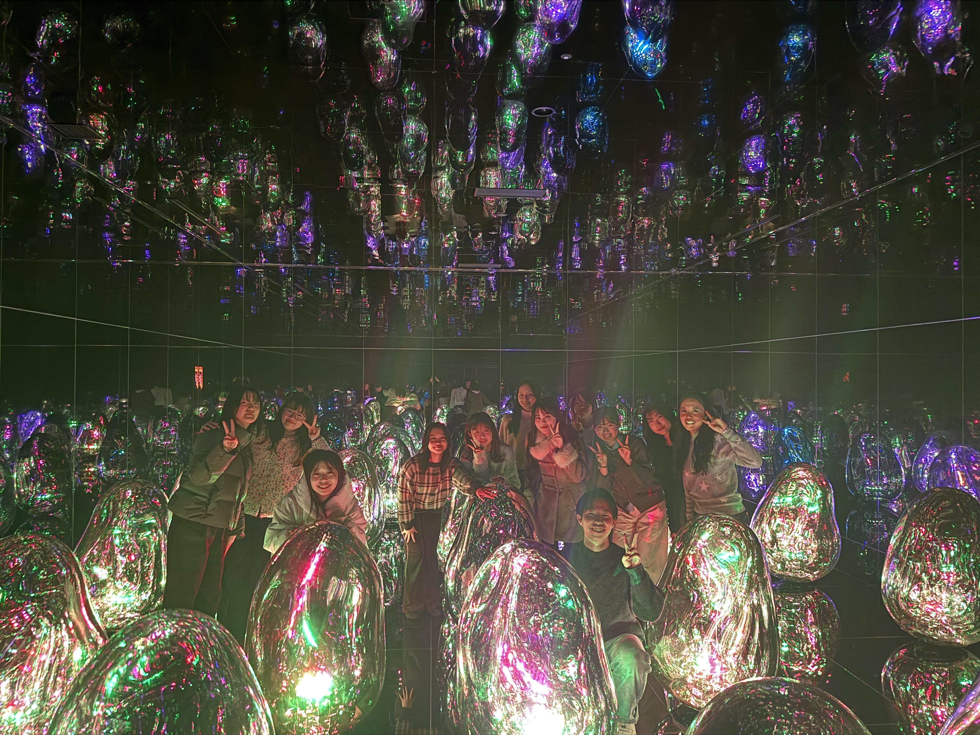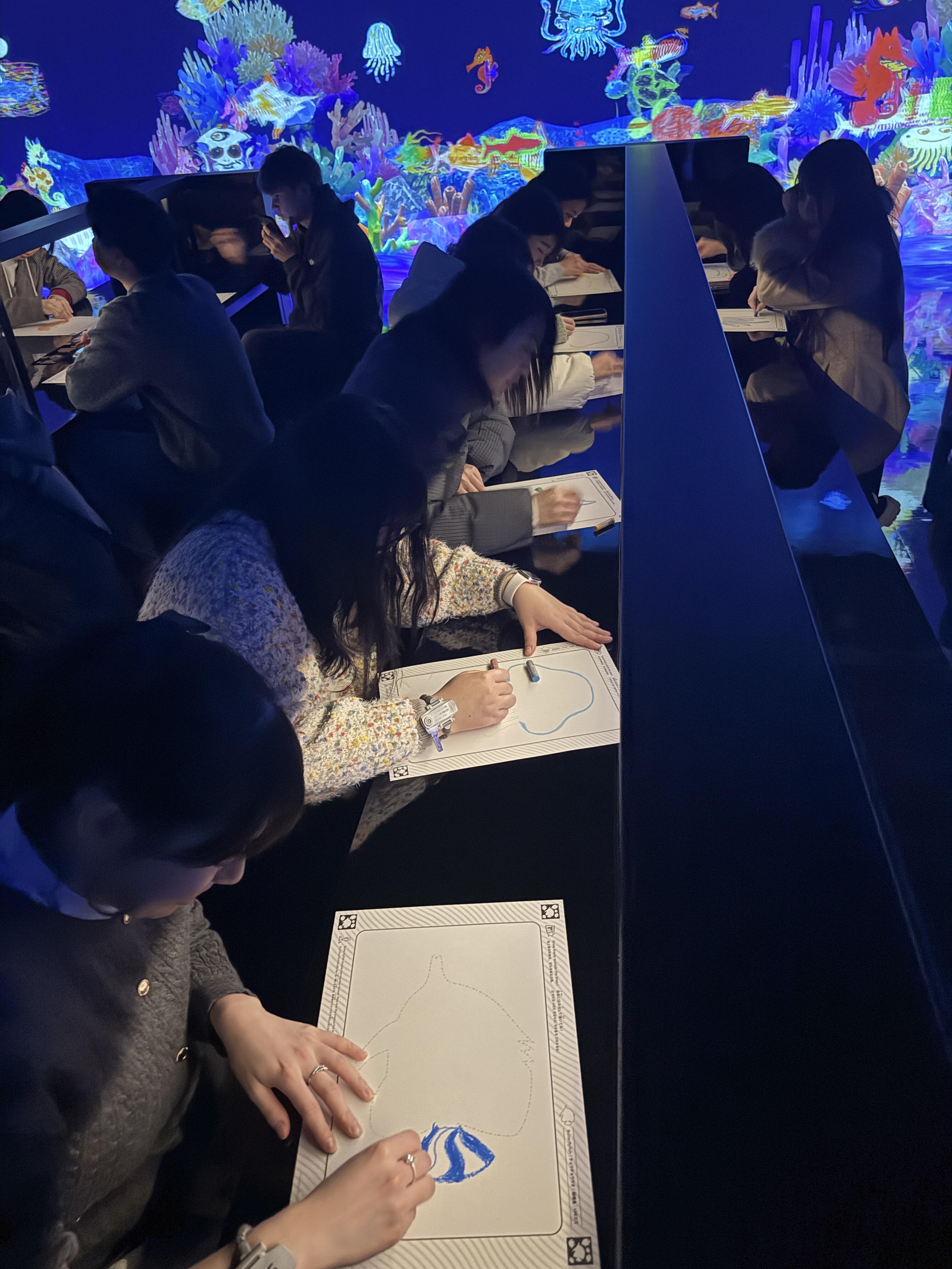 初日は8:30に京都駅へ集合。午前中は京都に新設された「チームラボ」を視察し、最先端の映像テクノロジーを用いたエンターテインメントの最前線を肌で感じました。