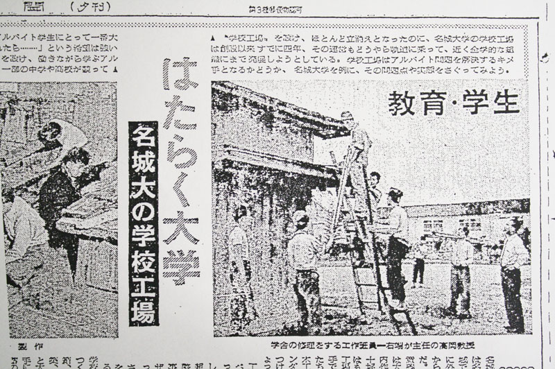 朝日新聞は1956年7月13日夕刊の教育欄で「はたらく大学 名城大の学校工場」として特集。高岡教授の「学生の頭と手と汗をもって、自分のものは自分でつくる」というセルフ・サポーティングの教育方式の狙いを紹介しながら、工作班の使命として3点を挙げています。(1)学内にアルバイトの場を設け、学資に恵まれない者にも大学教育の機会を与えるという厚生施設としての使命(2)働きながら学ぶ行学一体の教育的使命(3)私立大学は経営が苦しいため建設設備も乏しい。学校整備を建築業者に請負わせると少なくとも何百万かのまとまった資金を必要とする。これを工作班でやれば、毎月わずかな材料費とアルバイト手当で学校が整備できる。